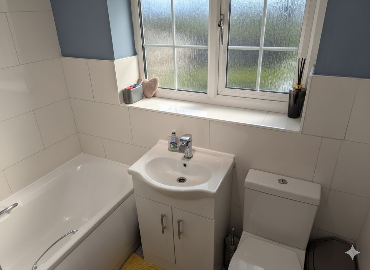 BATHROOM A modern white suite comprising panelled bath with Mira Sport shower above, low flush w.c., vanity wash basin, chrome heated towel rail, half tiled walls, double glazed window with extractor fan.