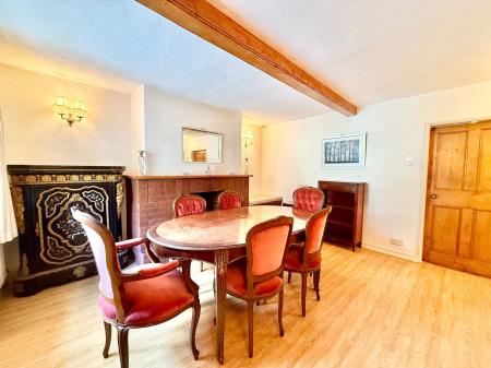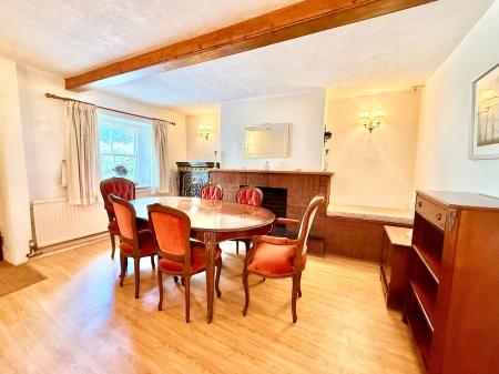 - Spacious dining room with exposed brick fireplace and ceiling timbers