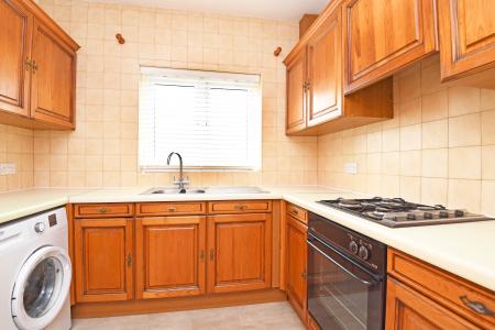Comprising wall and base units with integrated gas hob, oven and extractor above. Stainless steel sink with draining board, space for washer / dryer and full-height fridge / freezer. Window to the side.