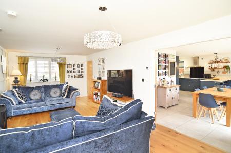 A stunning open-plan kitchen and living space with sitting and dining areas and glazed bi-folding doors leading to the garden. The kitchen comprises a range of David Charles Ash wood painted fitted units with Quartz worktop and breakfast bar, induction hob, double oven, integral Bosch appliances, fridge freezer, dishwasher and Franke boiling tap.