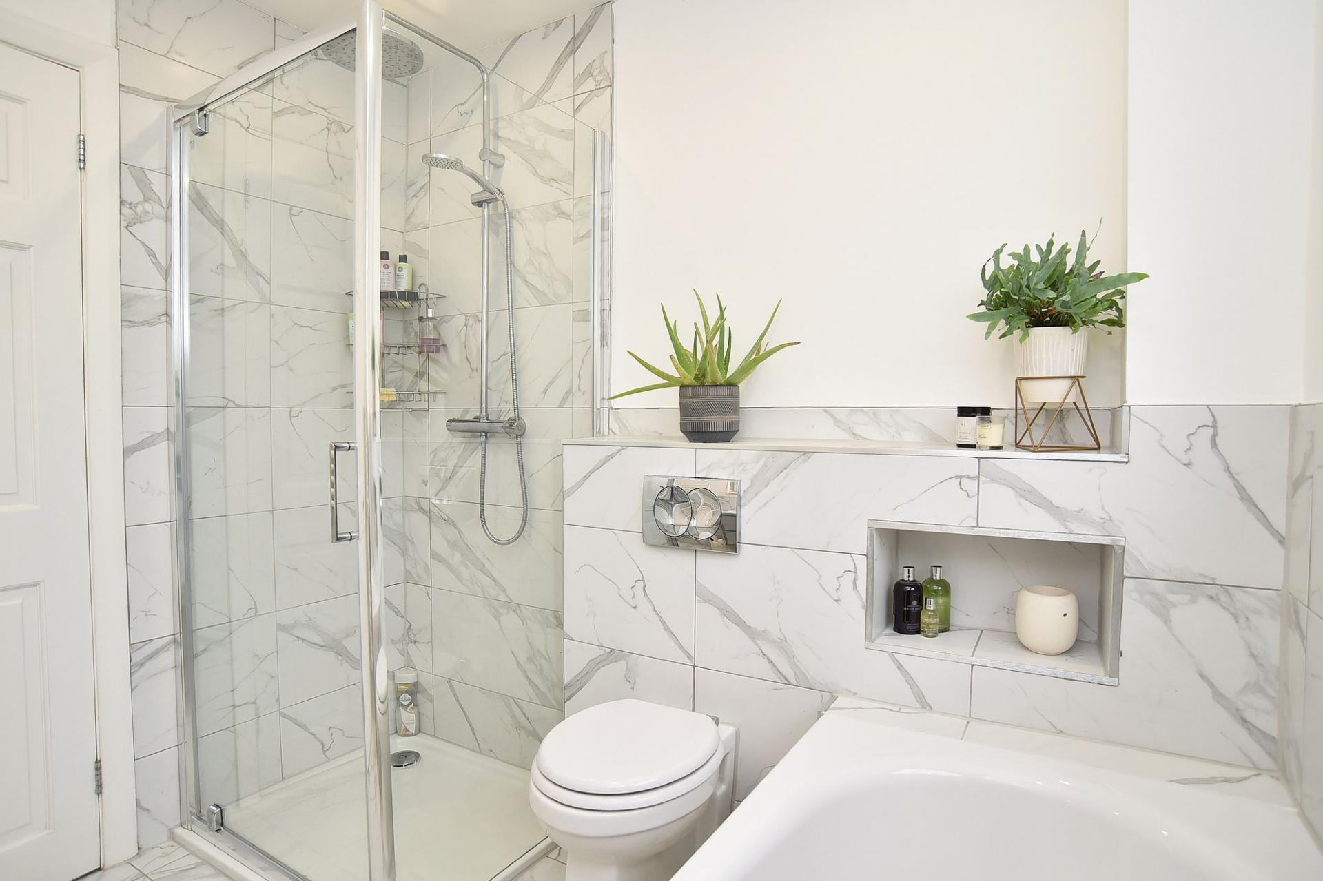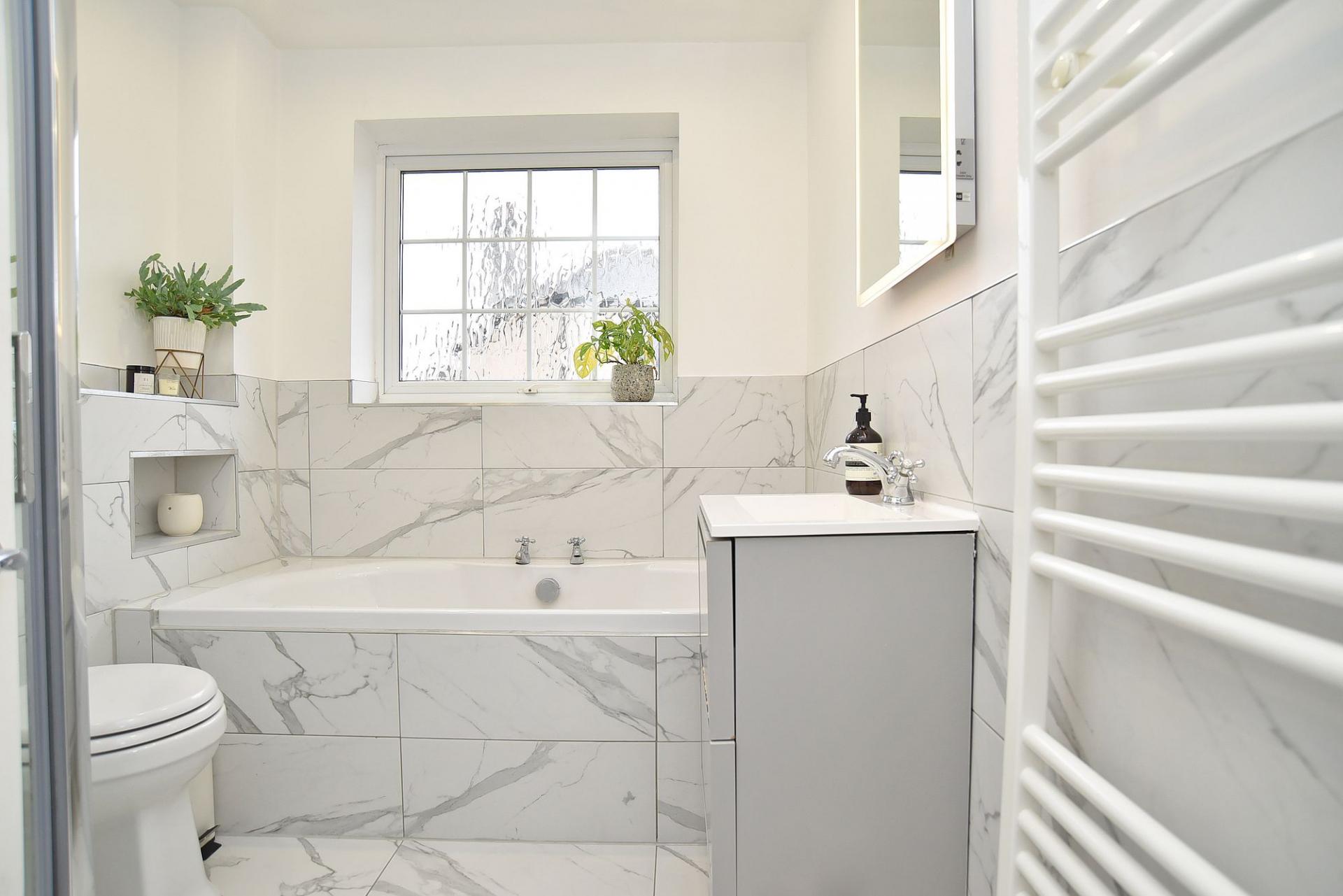 The contemporary house bathroom has been attractively refurbished and comprises a panelled bath, separate glazed shower enclosure with rainfall-style shower, low flush WC and modern wash hand basin with vanity storage. Stylish marble-effect tiling and chrome fittings create a sleek, high-quality finish.
