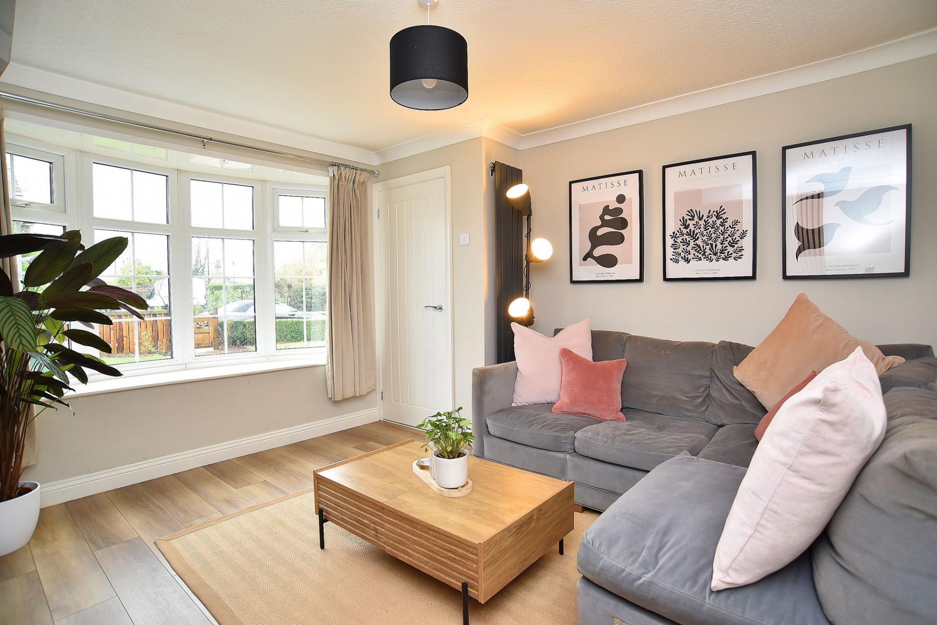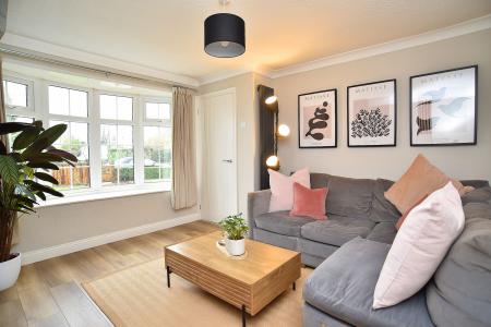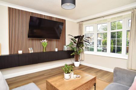 The welcoming entrance hall leads into a superb bay-fronted lounge, a bright and contemporary reception space finished in soft neutral tones. A striking slatted feature wall with integrated wall-mounted media unit creates a stylish focal point, while the proportions comfortably accommodate modern furnishings. The bay window allows excellent natural light and provides a pleasant outlook over the front garden.