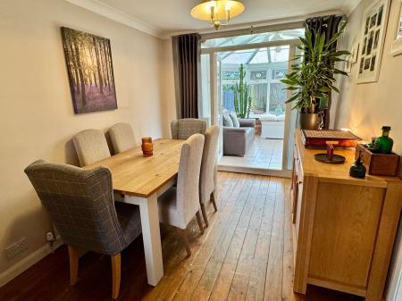 The accommodation opens into a welcoming entrance hall leading through to a spacious lounge with a clearly defined dining area, providing a comfortable and versatile living space. A door from the dining area leads into a conservatory extension, which enjoys views over the rear garden and offers additional reception space. The kitchen is fitted with a range of wall and base cupboards, providing practical storage and worktop space.