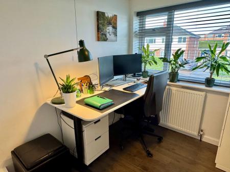 To the first floor, the principal bedroom is a good-sized double and features fitted wardrobes. Bedroom two is also a double room, positioned to the rear of the property, while bedroom three is a single room with a useful bulkhead storage cupboard presently used as a study with hardwired broadband. The modern and stylish house bathroom is fitted with a white four-piece suite comprising a bath, separate shower enclosure, WC and contemporary wash hand basin set within a vanity unit, complemented by fully tiled walls.