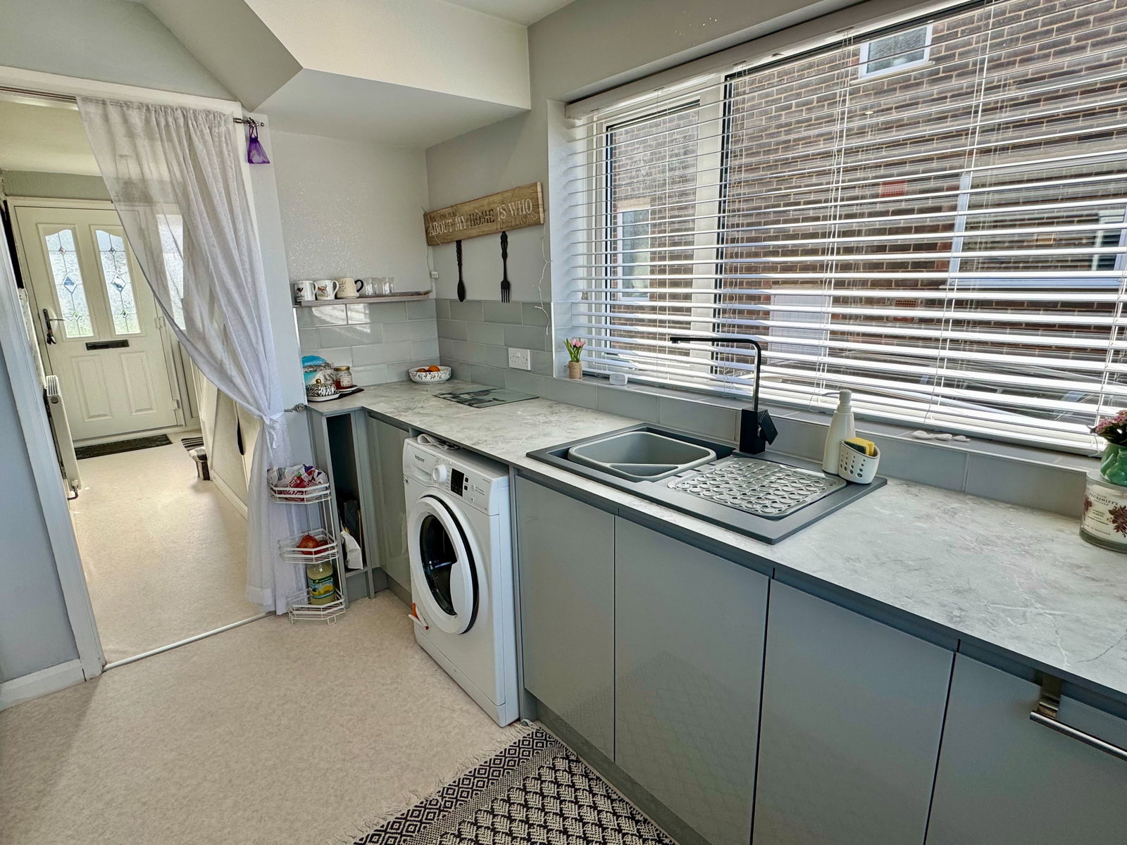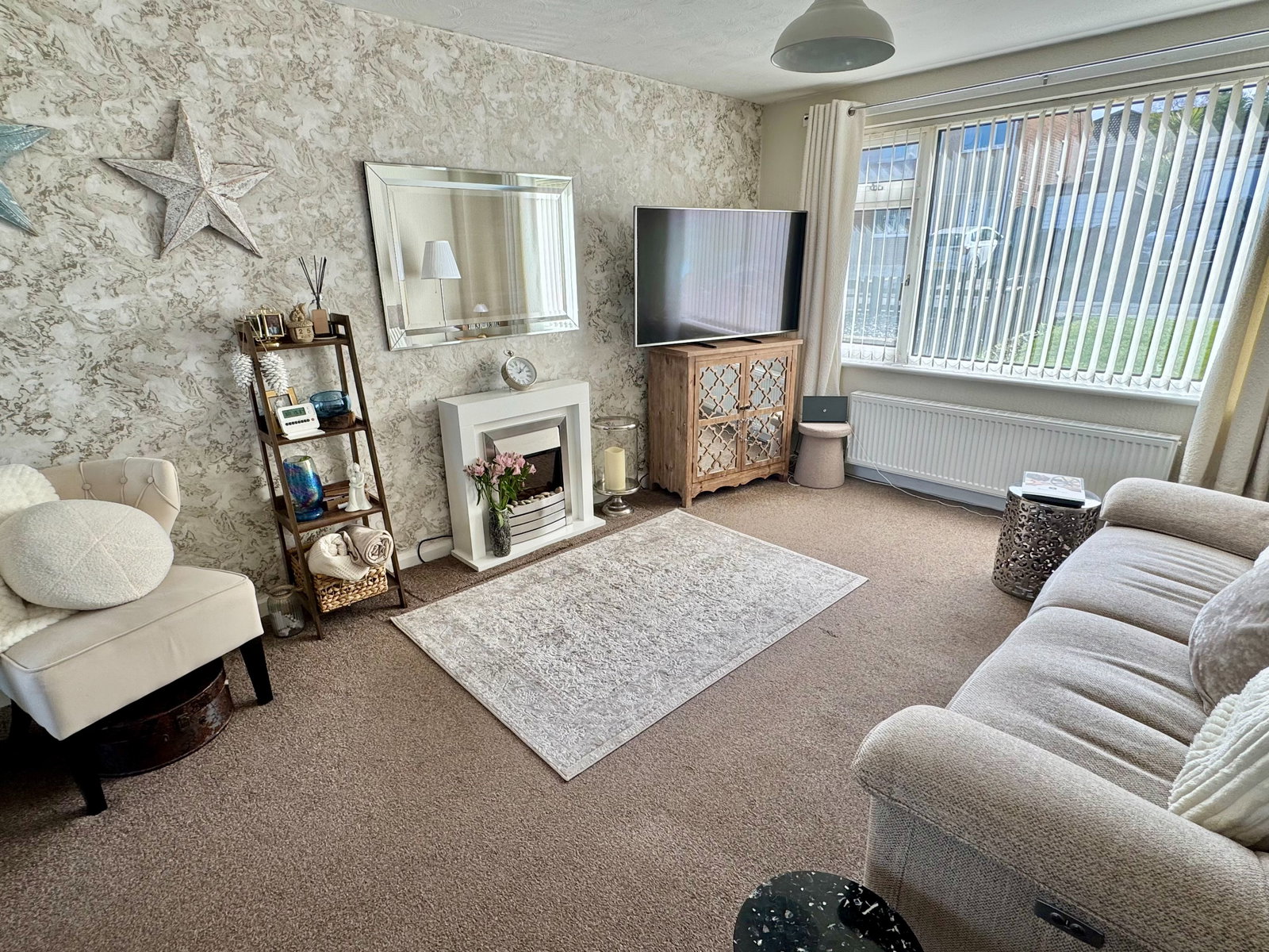 On the ground floor, a welcoming entrance hall with staircase to the first floor includes a useful understairs cupboard. The lounge is a comfortable reception room with electric fire and sliding doors opening to a separate dining room. The refitted kitchen is fitted with a modern range of wall and base cupboards, including a pull‑out larder and bin cupboard, complementary worktops and sink unit with mixer tap. Integrated appliances include Zanussi cooker, microwave and hood, together with fridge and freezer, with windows to two sides providing excellent natural light.