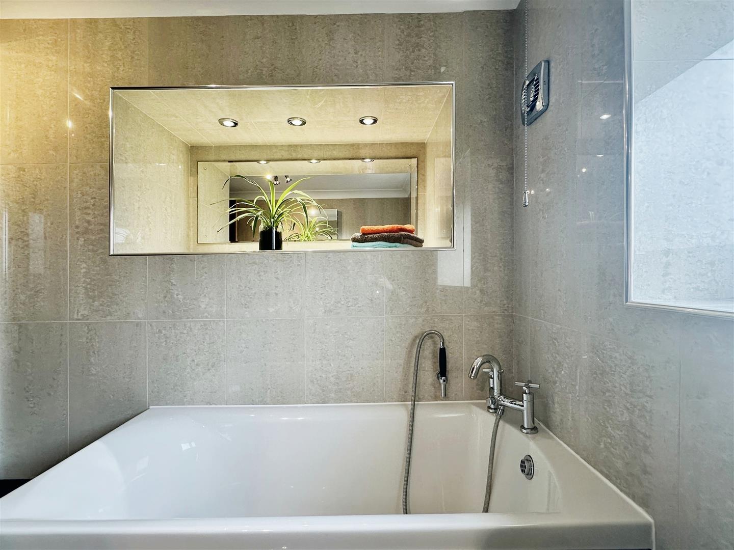 Bathroom - A modern suite which comprises; bath, W.C. pedestal wash hand basin, tiled flooring tiled walls, ceiling light, coving to the ceiling, heated towel rail, uPVC double glazed window, extractor, alcove providing shelving space with an inset mirror
