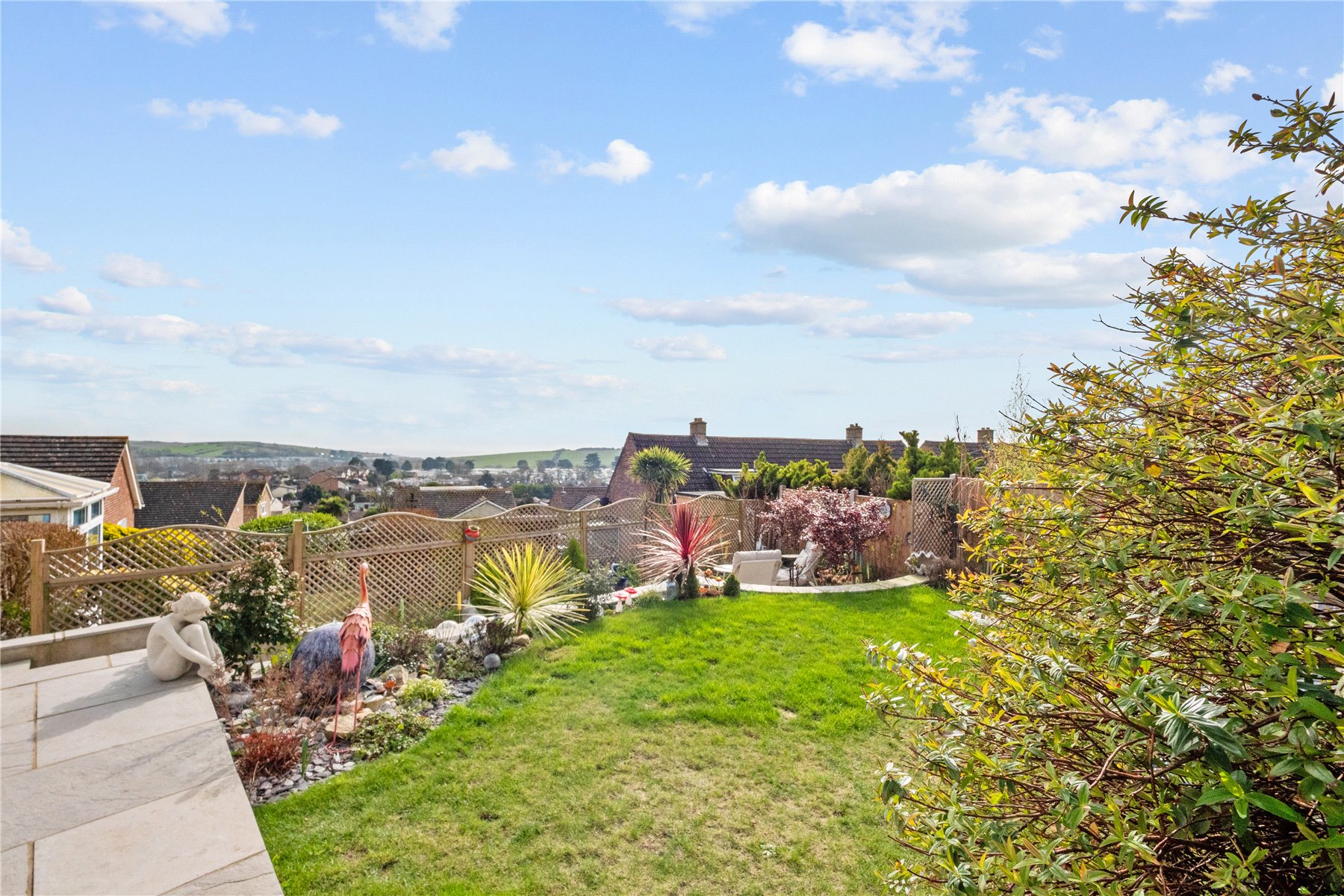 The fully enclosed REAR GARDEN has some fabulous far-reaching views towards the sea. This peaceful haven has a central lawn and beautifully planted borders plus a ceramic ball, water feature creating an appealing retreat. Immediately abutting the rear of the house is a generous, sunny terrace, ideal for entertaining. Steps lead down to a shingle path and a circular paved Aztec sun terrace, a wonderful sun trap. On a practical note, there is a timber shed, outside tap and sockets.