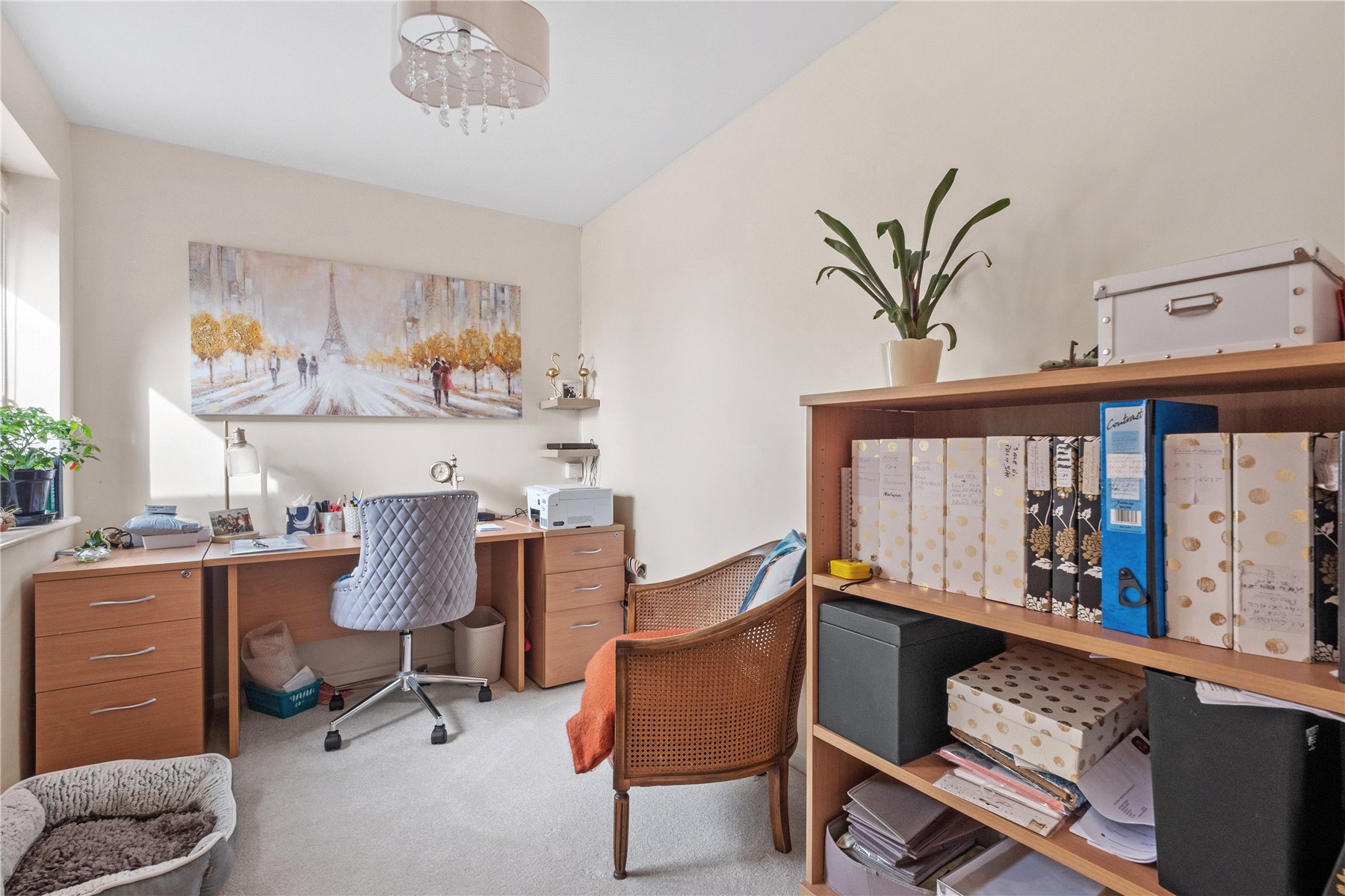 BEDROOM TWO, also a front-facing generous double, benefits from a full wall of fitted wardrobes providing ample storage space. From the hall, steps lead down to an inner lobby with a shelved airing cupboard with radiator, and an interior wall aperture overlooking the dining room. To the rear, is BEDROOM THREE, a comfortable single, currently utilised as a study.