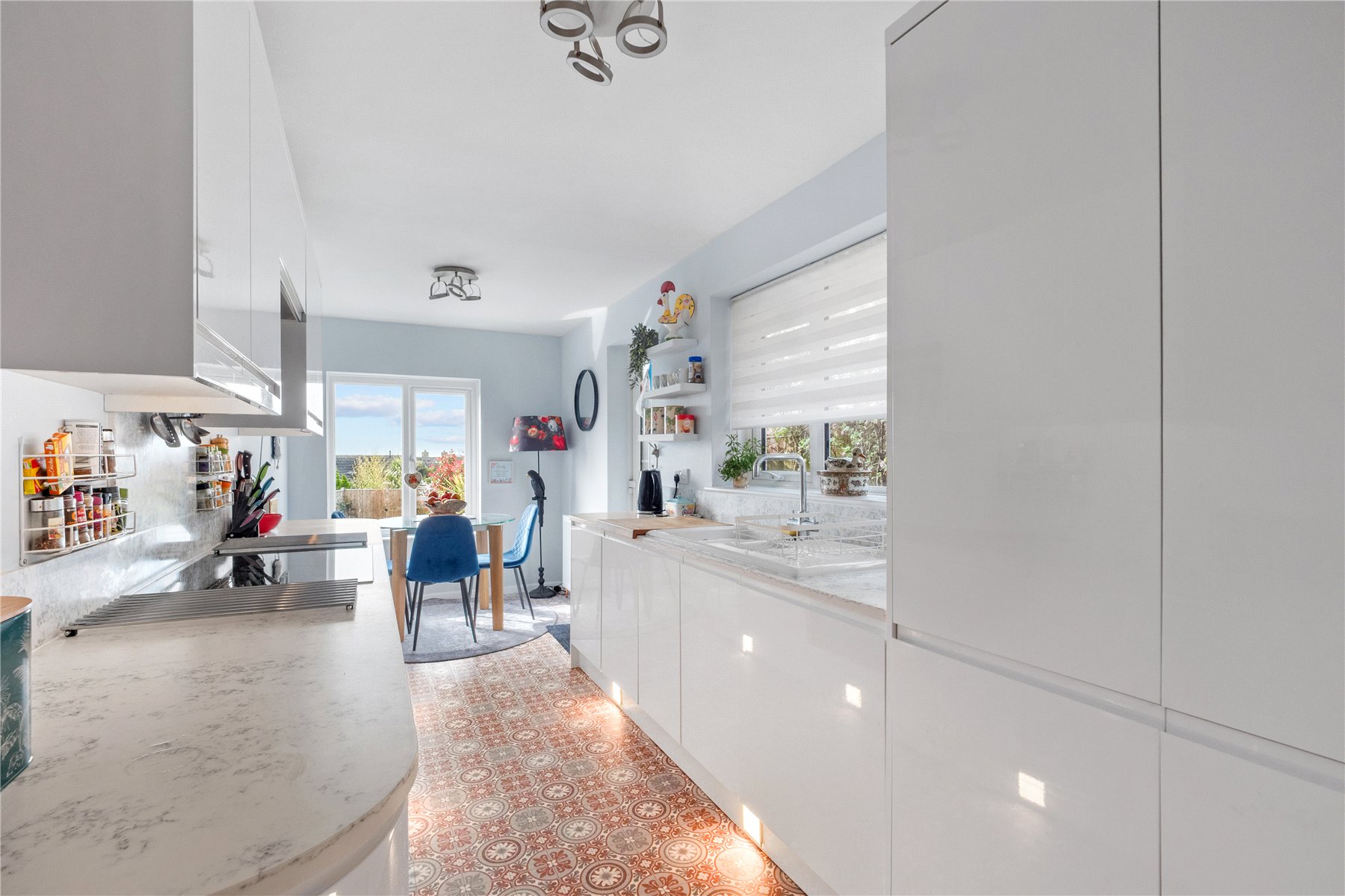 A door leads into the impressive double-aspect KITCHEN/BREAKFAST ROOM, newly fitted with sleek, white, wall and base cabinets, composite worktops and splashbacks, task lighting and atmospheric plinth lighting. Integrated appliances include a tall NEFFfridge freezer, Zanussi six-place dishwasher, Zanussi washing machine, and a Russell Hobbs five-ring ceramic hob with oven below and extractor above. Pull-out wired larder drawers add practicality, while a 1½ bowl ceramic sink and drainer, with mixer tap, sits beneath the window. There is ample space for a breakfast table and chairs beside the large rear window enjoying lovely garden views. A part-glazed door provides access to the side passage and garden.