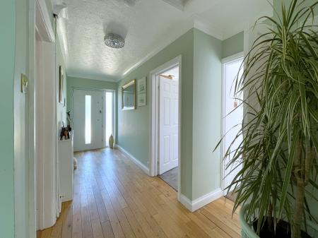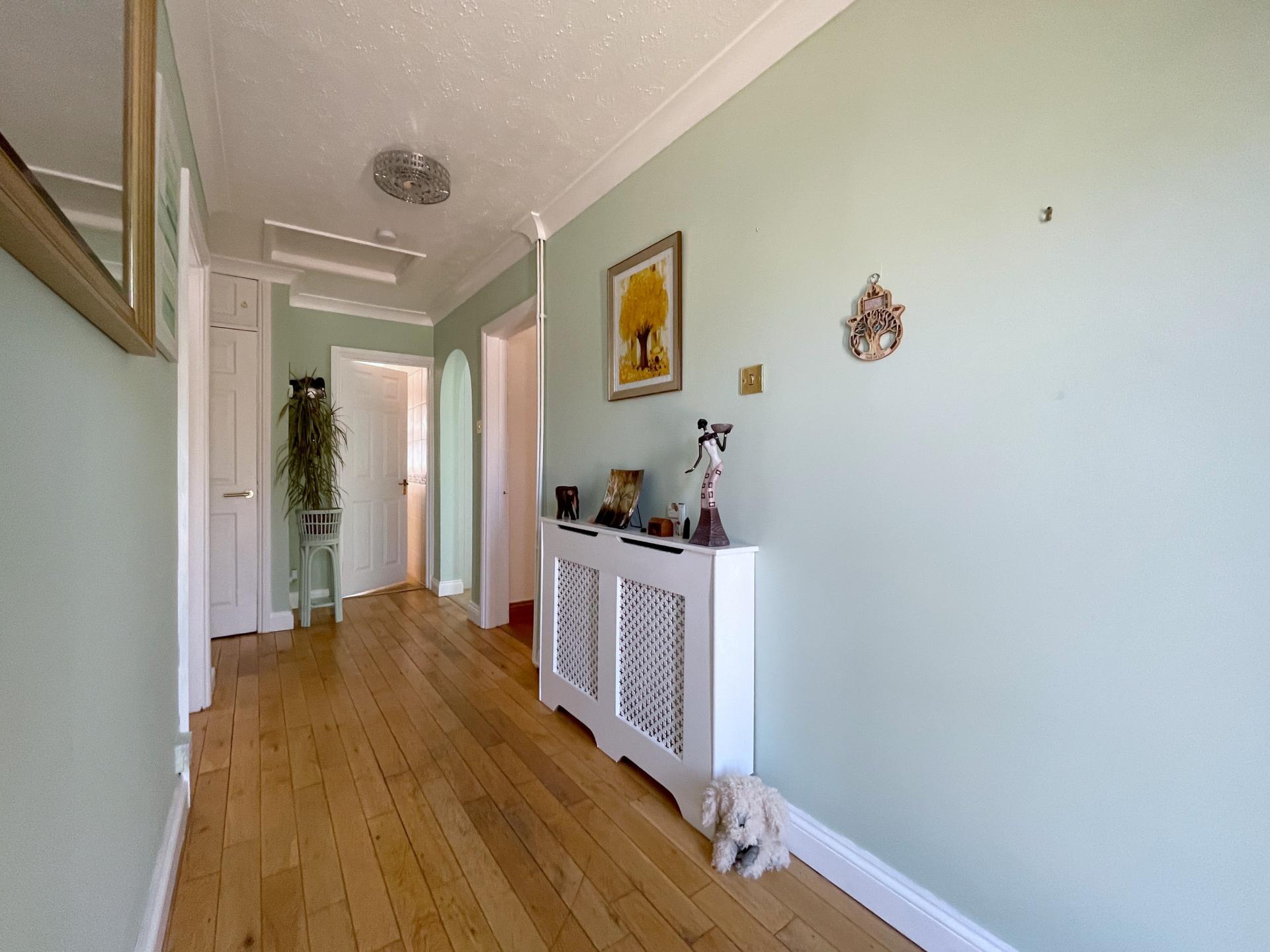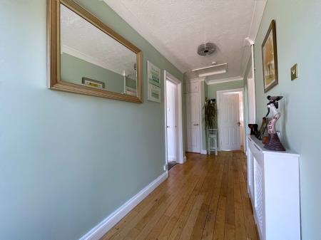 ENTRANCE HALLWAY 6' 10" x 16' 8" (2.10m x 5.10m) With textured and coved ceiling, centre light point, smoke alarm, loft access to part boarded loft with lighting, sold oak flooring, radiator with cover, telephone point, storage cupboard off housing hot water cylinder with slatted shelving. Door off leading into: