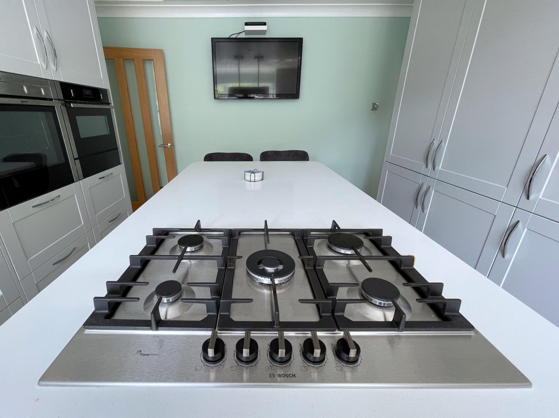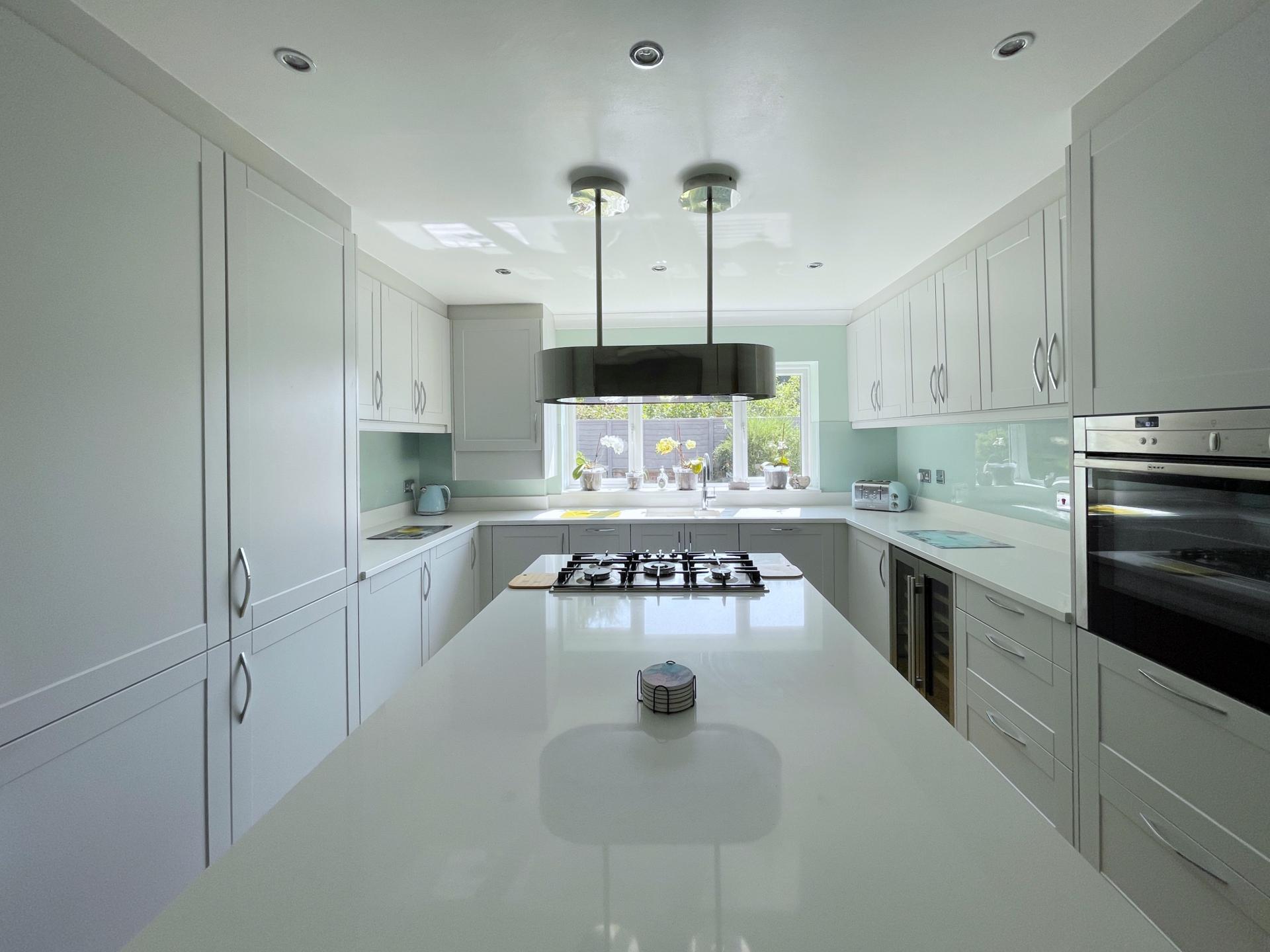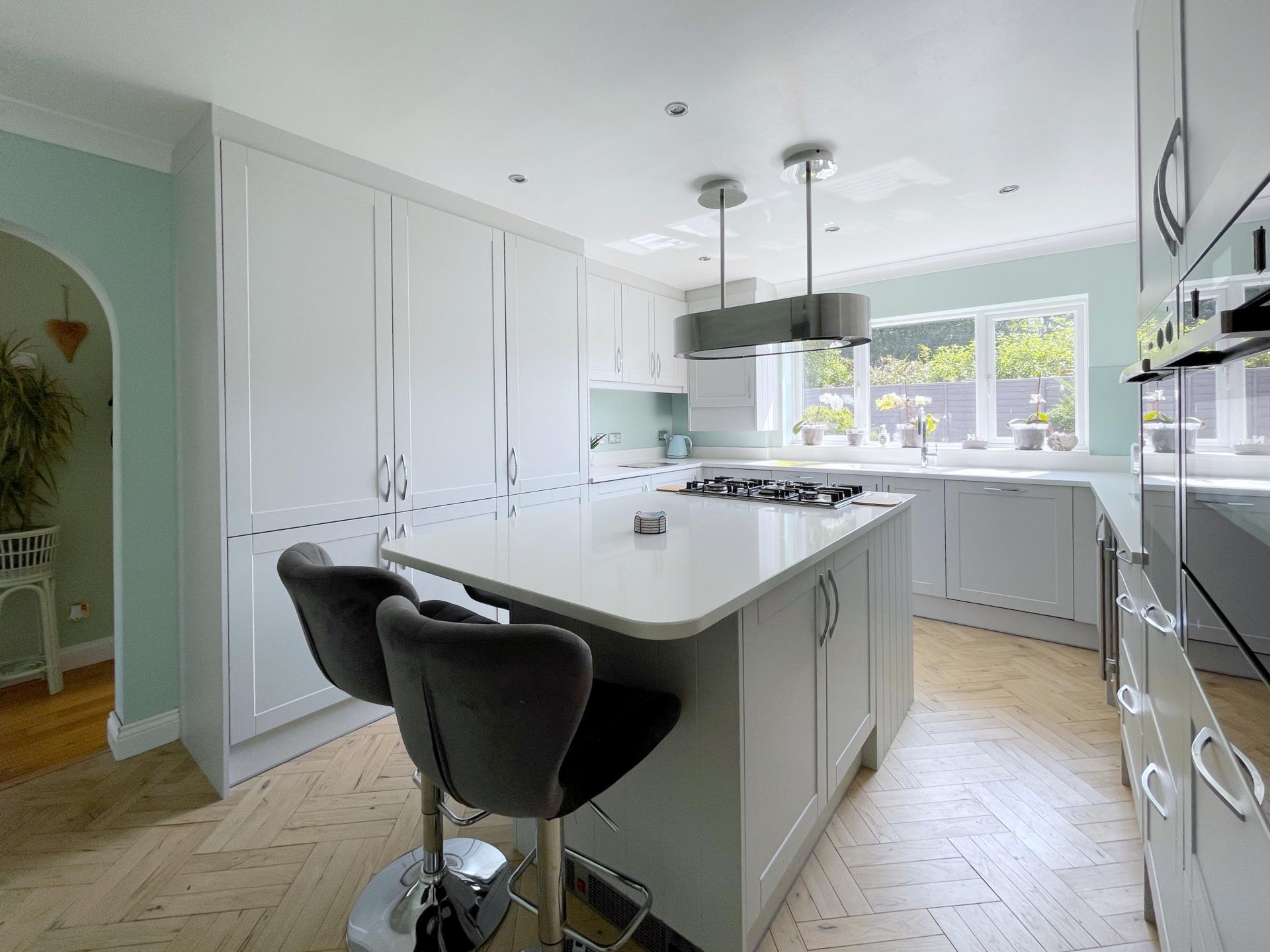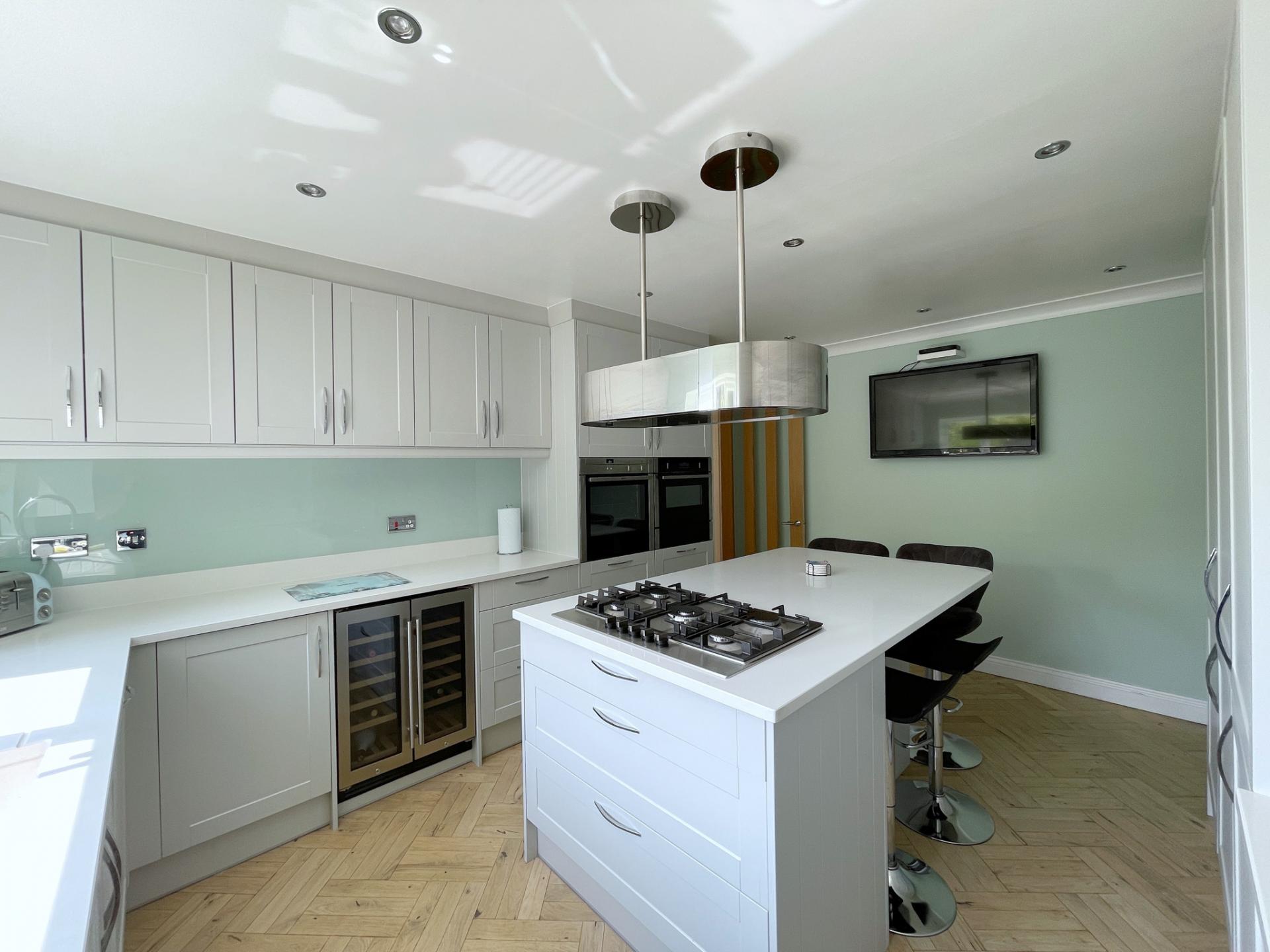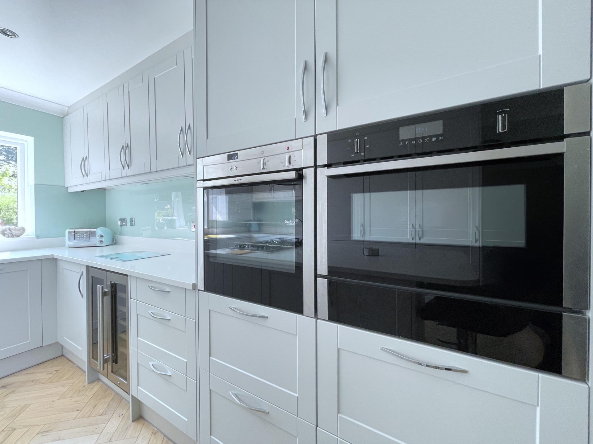 KITCHEN/BREAKFAST ROOM 11' 11" x 15' 8" (3.65m x 4.78m) Recently re-fitted with UPVC double glazed window to the rear elevation, skimmed and coved ceiling with inset LED lighting, TV point, oak flooring, central island, matching with cabinets and further drawer units, breakfast bar stools, integrated Bosch five ring gas hob with stainless steel extractor hood over, integrated NEFF stainless steel fan assisted oven, integrated NEFF combination microwave with plate warmer, double stainless steel wine cooler fridge, full sized integrated NEFF dishwasher, integrated tumble dryer, integrated NEFF washing machine, 2 x fitted integrated larder fridges, 2 x fitted integrated freezer, concealed Valiant gas boiler fitted into cupboard, fitted with a wide range of tallboy, base, eye level and drawer units with quartz worktops over, quartz splashbacks, further glass splash backs over, built in quartz drainer into inset one and a half bowl sink with Quooker tap (instant hot water), heaters built into bottom of cupboards. Via solid oak door leading into: