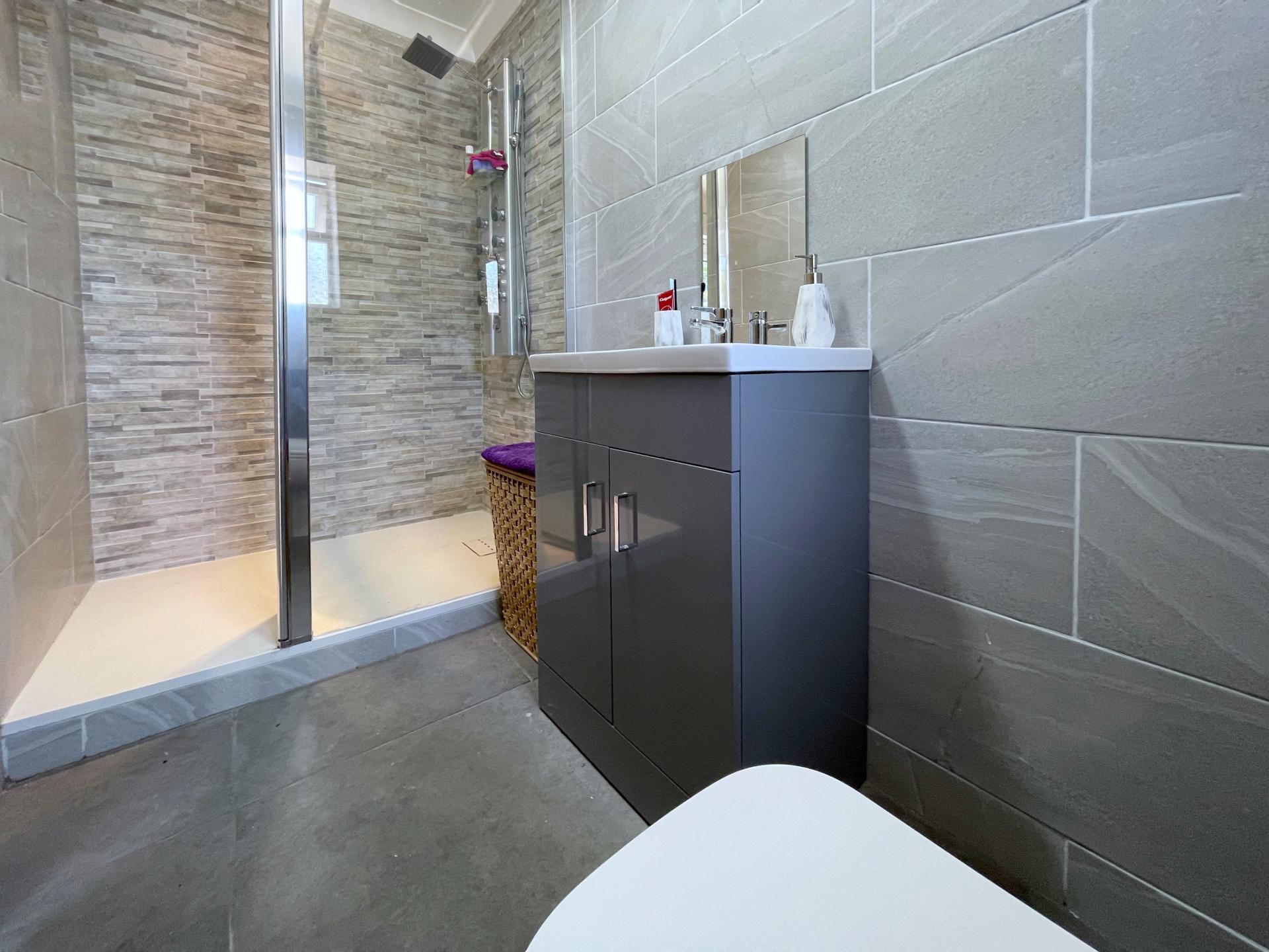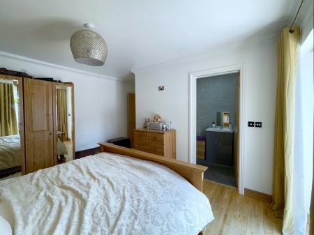 MASTER ENSUITE 4' 3" x 9' 3" (1.32m x 2.82m) With obscured UPVC double glazed window to the side elevation, skimmed and coved ceiling with centre light point, built in extractor fan, fully tiled walls, tiled floor, full length heated stainless steel towel rail, fitted with a three piece suite comprising low level WC, wash hand basin with mixer tap fitted into vanity unit with storage below, glass shower enclosure with multi jet shower with further rainfall shower head and shower attachment tap, underfloor heating.