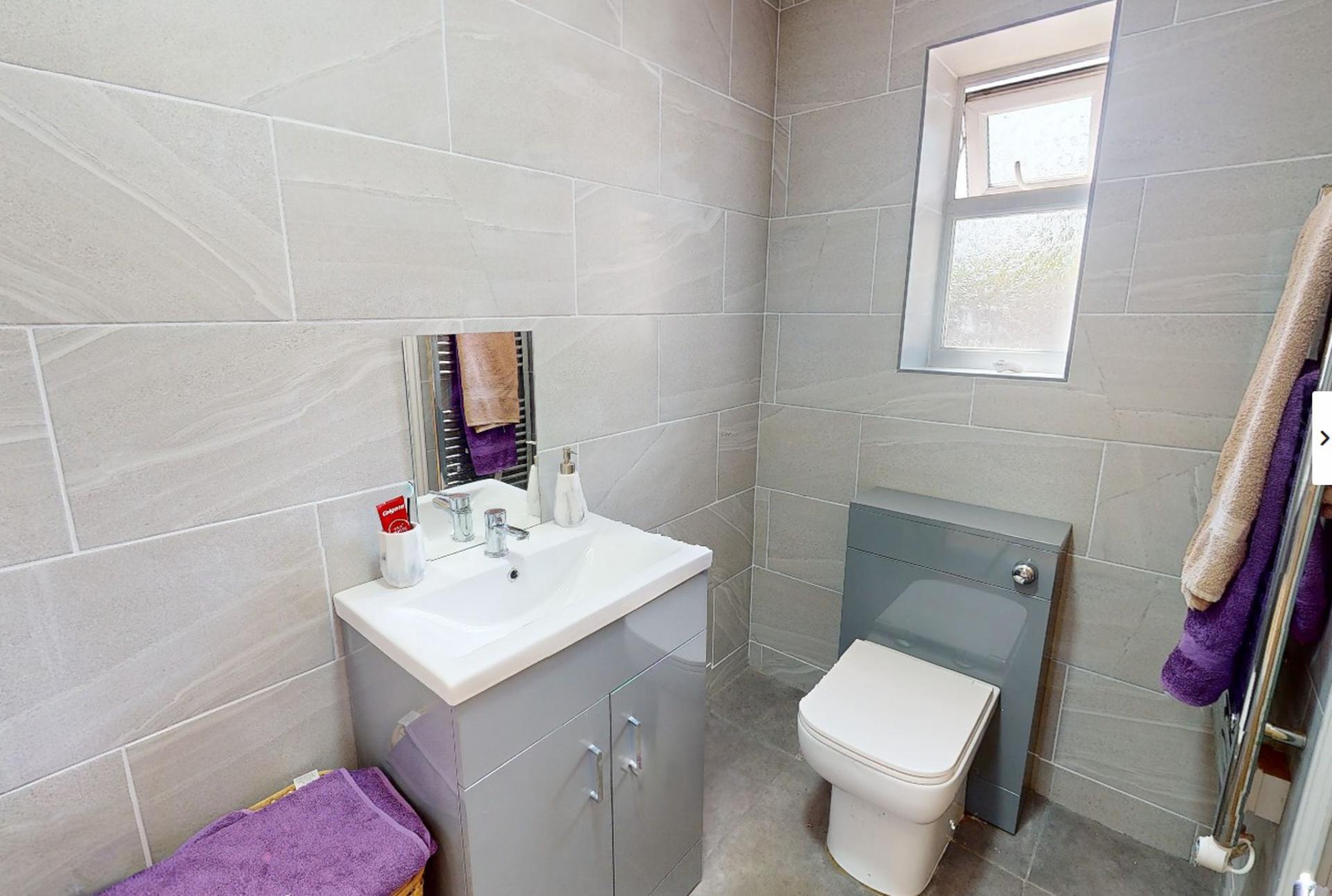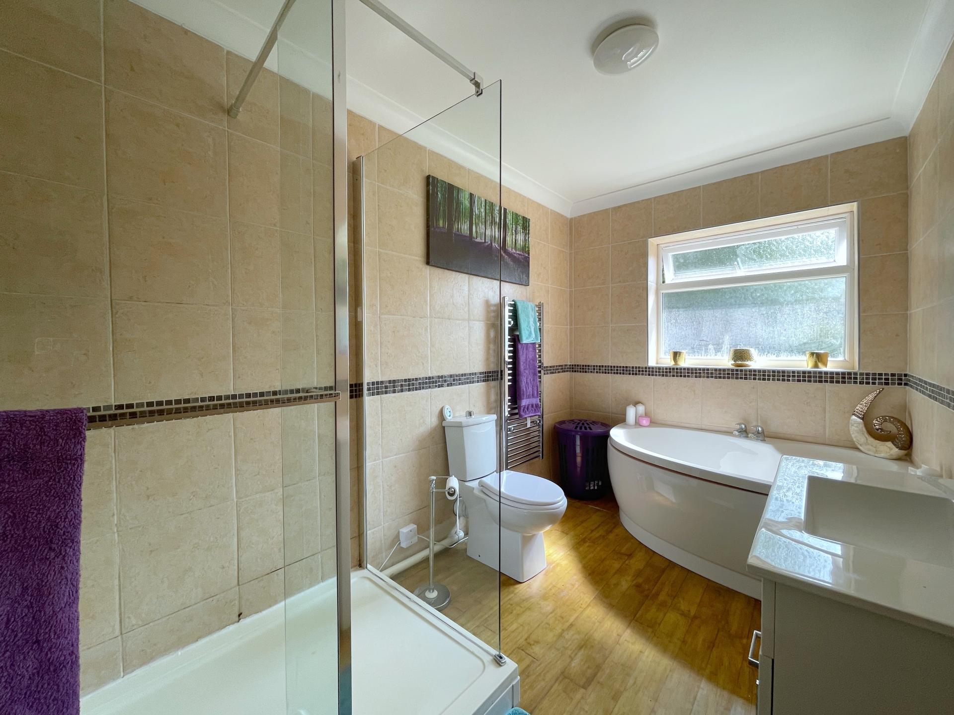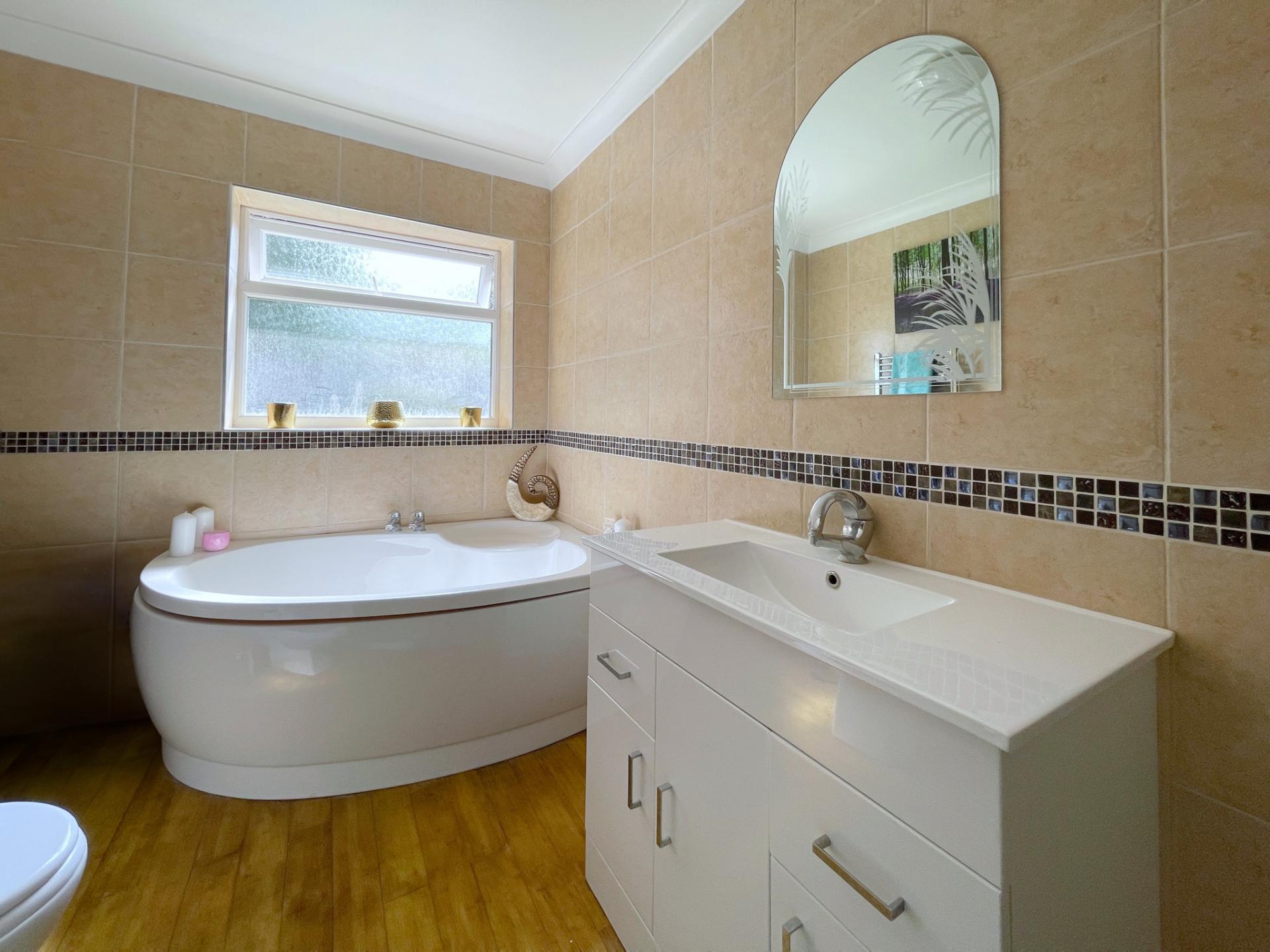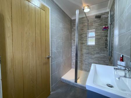 FAMILY BATHROOM 6' 9" x 11' 6" (2.08m x 3.52m) Obscured UPVC double glazed window to the rear elevation, skimmed and coved ceiling with centre light point, fully tiled walls, solid bamboo flooring, full length stainless steel heated towel rail, fitted with a four piece suite comprising of low level WC, wash hand basin fitted into vanity unit with storage below and mixer tap, glass mirror, corner bath with central taps, walk in shower enclosure with rainfall shower head and further shower attachment tap.