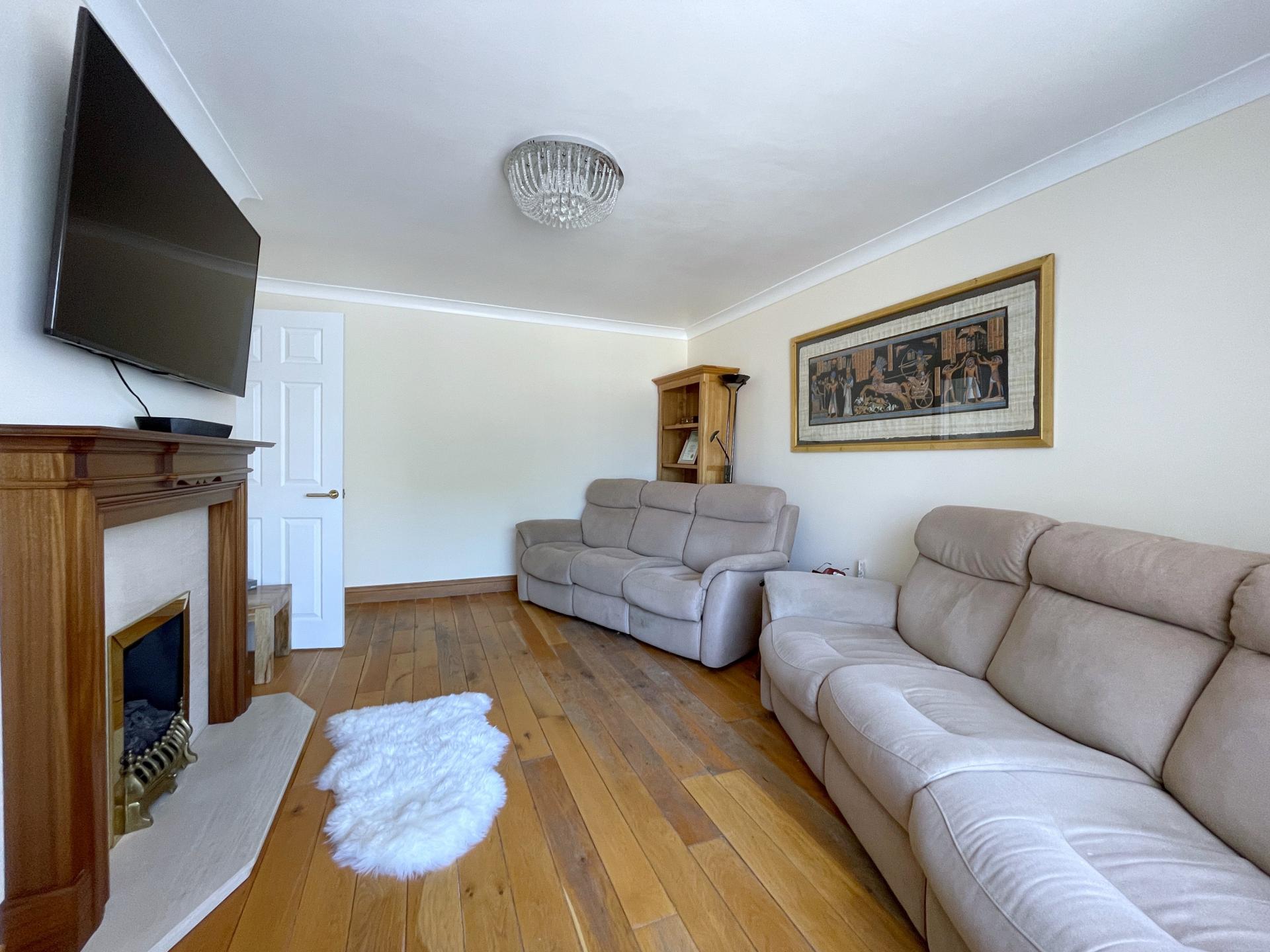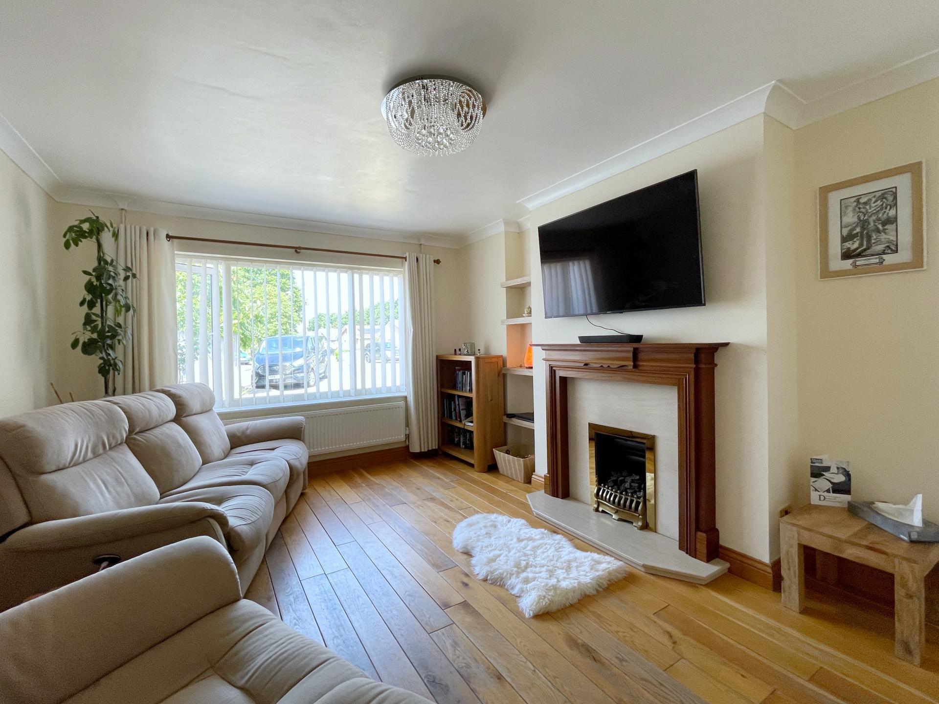LOUNGE 11' 9" x 15' 8" (3.59m x 4.78m) UPVC double glazed window to the front elevation, skimmed and coved ceiling with centre light point, single radiator, solid oak plank flooring, feature wooden fire surround with marble insert and marble hearth with fitted coal effect gas fire, shelving into recess, TV point, telephone point, dimmer switches.