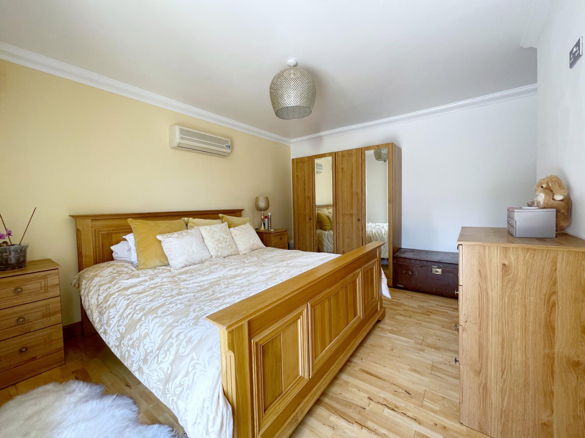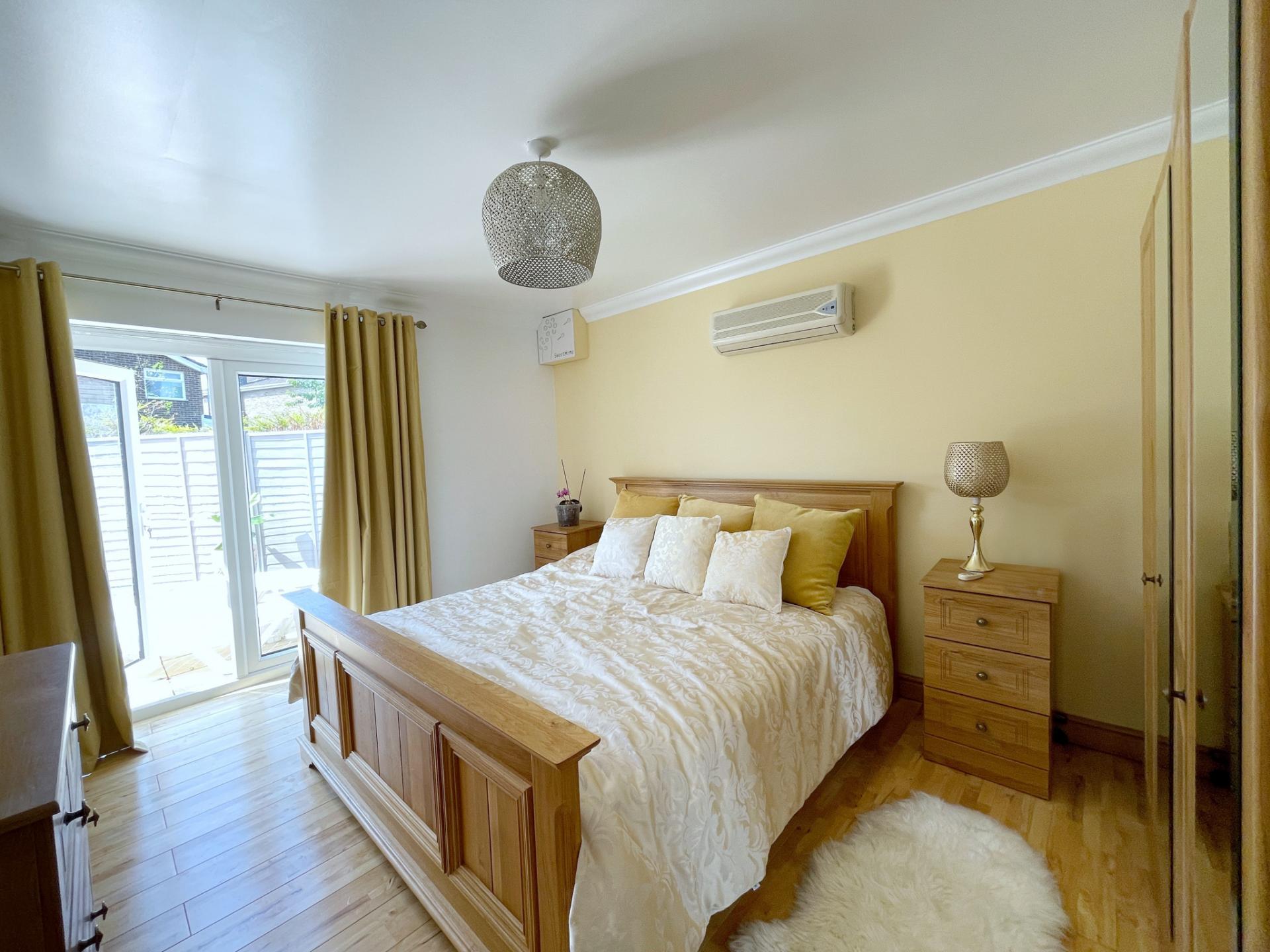 MASTER BEDROOM 13' 8" x 15' 8" (4.17m x 4.78m) With UPVC double glazed French doors to the side elevation leading onto south facing patio area, skimmed and coved ceiling with centre light point, wall mounted air conditioning unit, solid oak flooring.