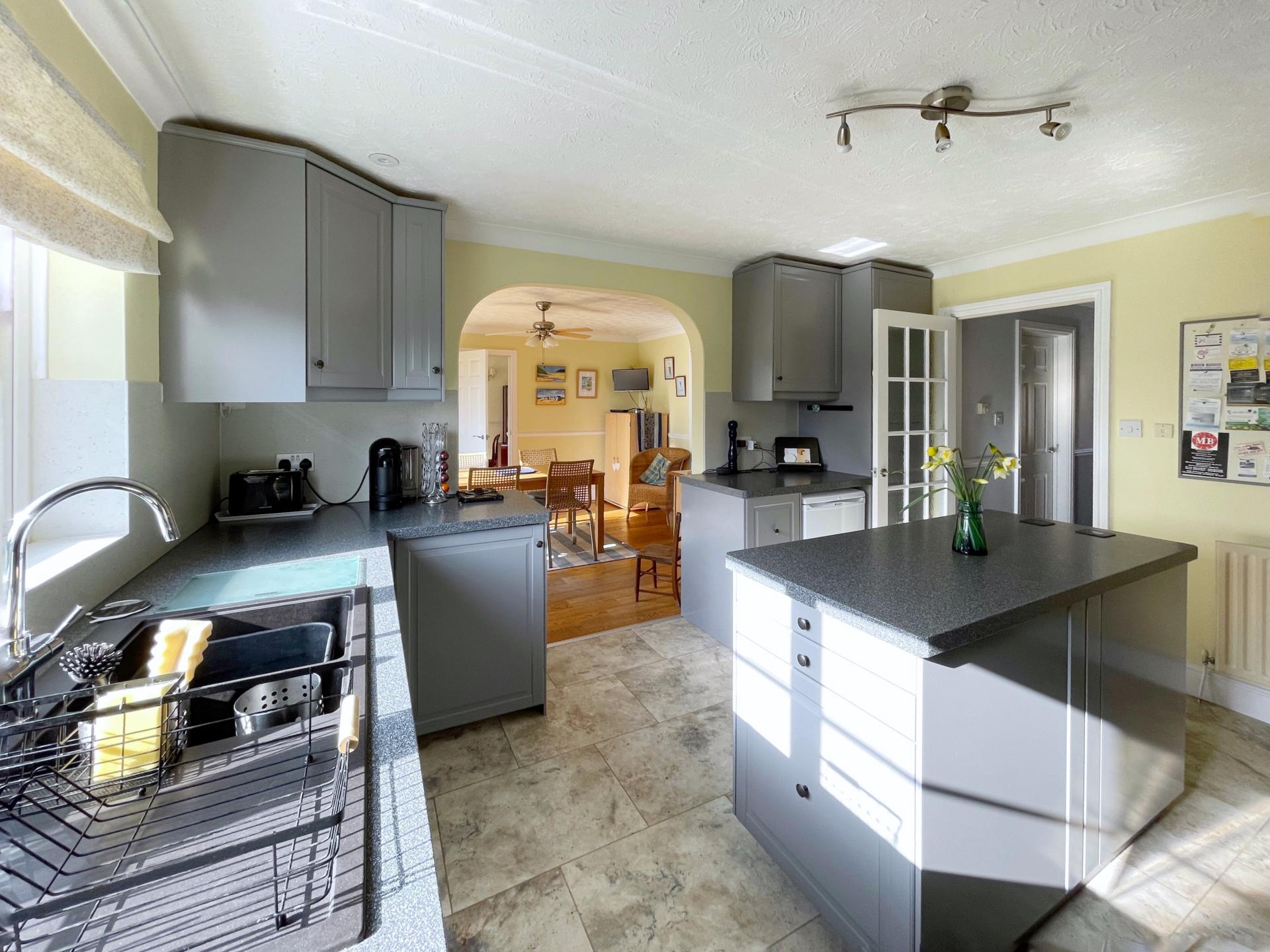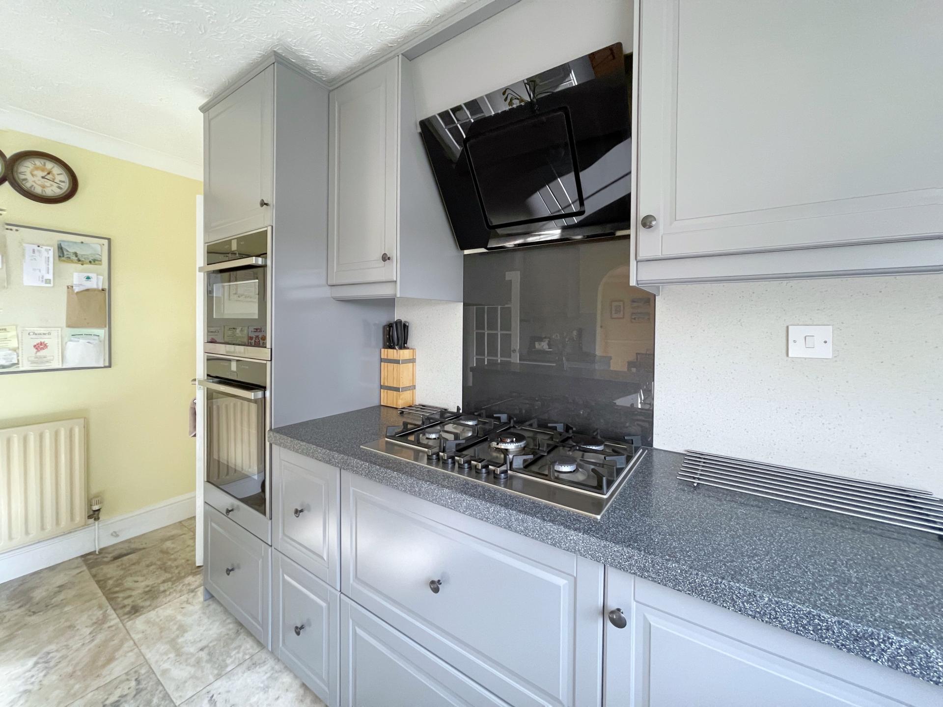 KITCHEN 11' 9" x 13' 6" (3.60m x 4.14m) UPVC double glazed window to the rear elevation, coved and textured ceiling, centre light point, spotlights, radiator, Karndean flooring, fitted with a wide range of base, eye level and drawer units with work surfaces over, composite splashbacks, central island with further base and drawer units, integrated Neff stainless steel fan assisted oven, integrated stainless steel combination oven, integrated 5 ring gas hob, canopy extractor hood over, integrated AEG dishwasher, inset one and a half bowl sink with Carron Phoenix hot water tap. Open archway into Breakfast Room, door into: