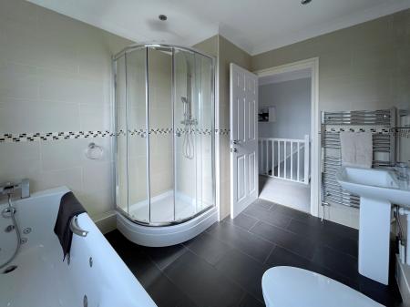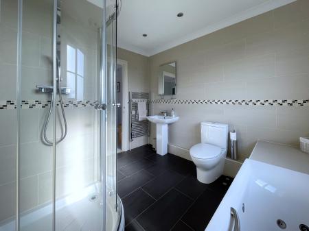 FAMILY BATHROOM 8' 1" x 9' 8" (2.47m x 2.95m) UPVC double glazed window to the rear elevation, coved and textured ceiling, inset downlighters, extractor fan, tiled flooring with under floor heating, fully tiled walls, stainless steel heated towel rail, illuminated mirror with glass shelving. Fitted with a four piece suite comprising low level WC, pedestal wash hand basin with rainfall mixer tap, Spa bath with multi jets, rainfall mixer tap and shower attachment tap, fully tiled shower cubicle with fitted rainfall shower head and further shower attachment tap.
