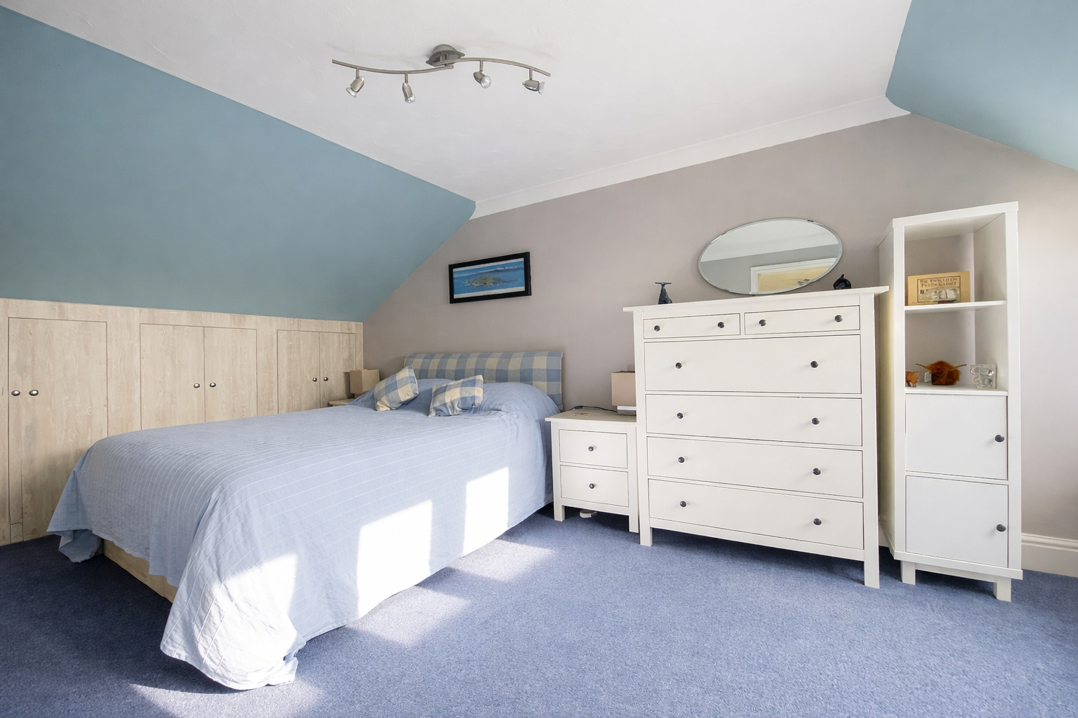 BEDROOM 3 8' 9" x 17' 7" (2.69m x 5.37m) 3 Velux windows, coved and textured ceiling, centre spotlights, double radiator, storage cupboards fitted into eaves.