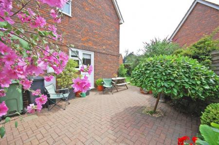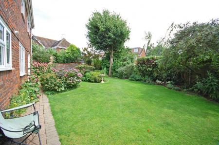 Part-walled and part-fenced rear garden with patio area to immediate rear and side, remainder laid to lawn with an array of shrubs, mature trees and flower beds to borders, gated side access to driveway, access door to garage and access door to brick-built potting shed (next to garage).