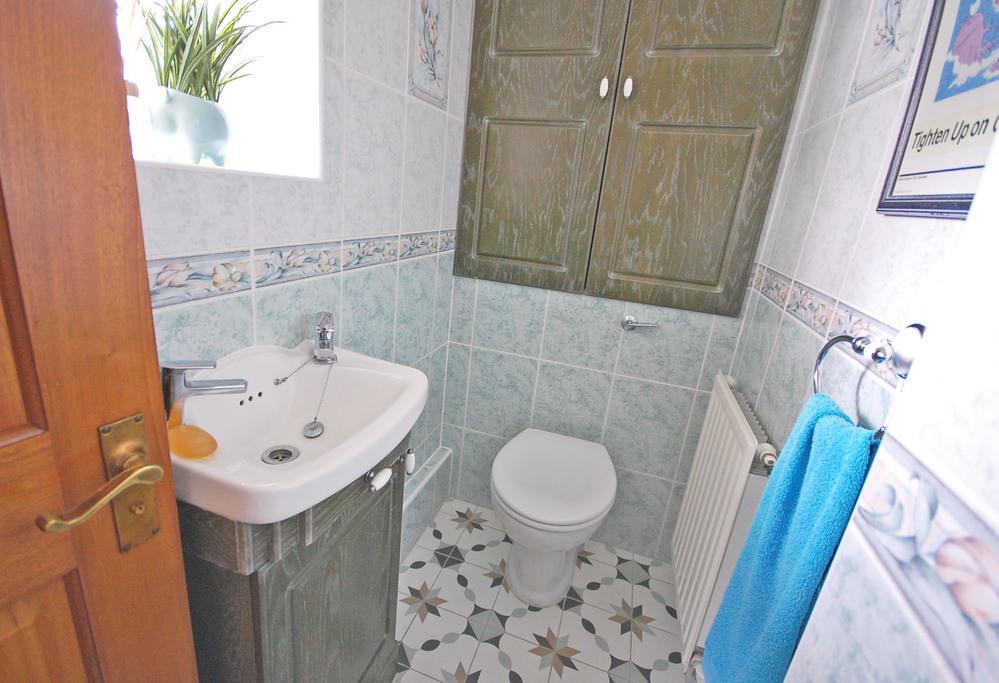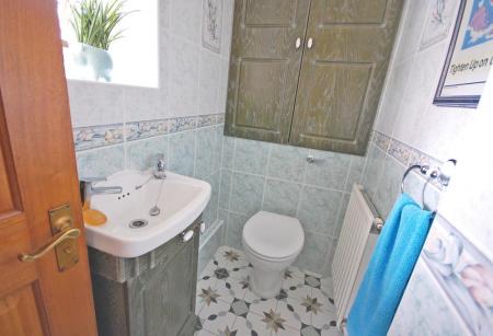 Opaque double glazed window to side aspect, inset WC, vanity wash hand basin, built-in storage cupboard, radiator, tiled flooring.