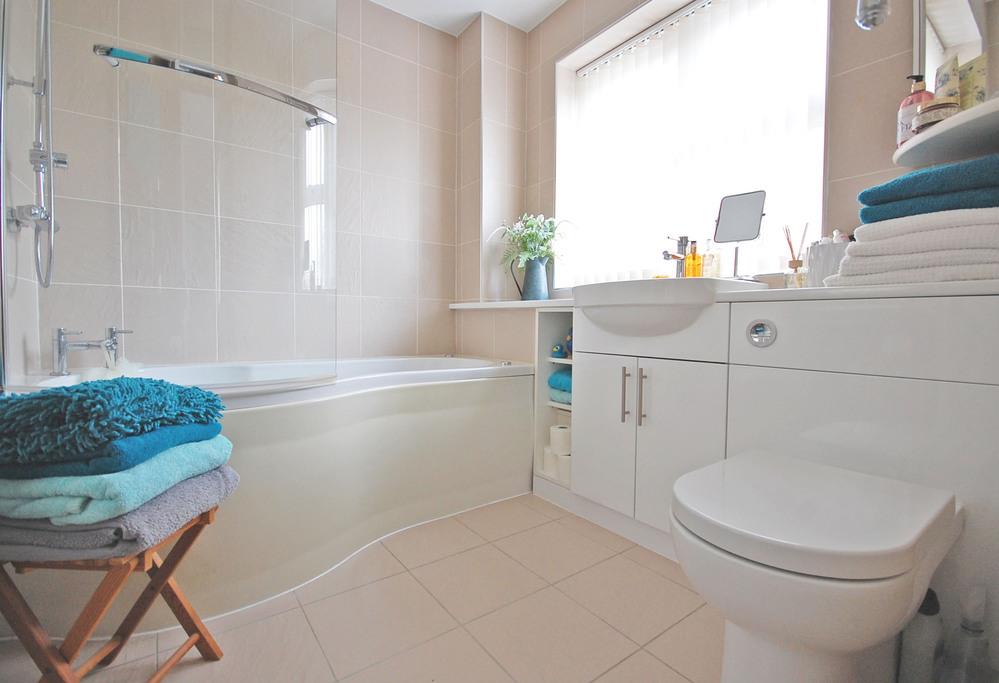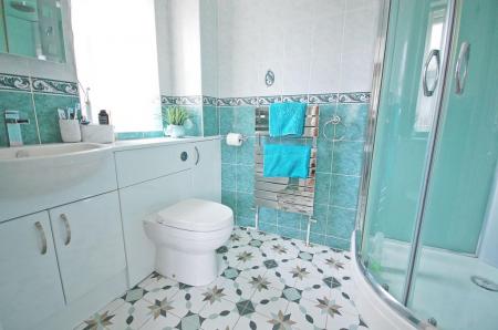 Opaque double glazed window to front aspect, panelled bath with central mixer tap and dual shower over inc. rainfall shower head, inset WC, vanity wash hand basin, heated towel rail, tiled flooring with underfloor heating and smooth ceiling with sunken spotlights.