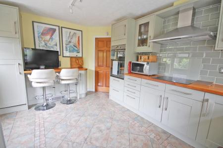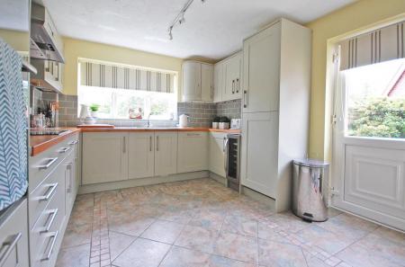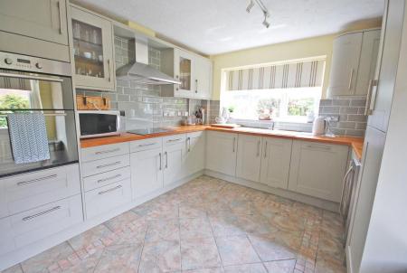 Double glazed windows to side and rear aspects, edged work surfaces in solid oak with a series of matching base and wall units, incorporating one and a half ceramic sink with central mixer tap, drainer and water softener, built-in double oven, induction hob with extractor hood over, integrated fridge, freezer and dishwasher, wine cooler, tiled flooring. Door to side.