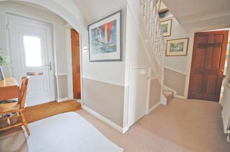 Part-glazed entrance door, stairs to first floor with understairs storage cupboard, radiator, carpet to floor.