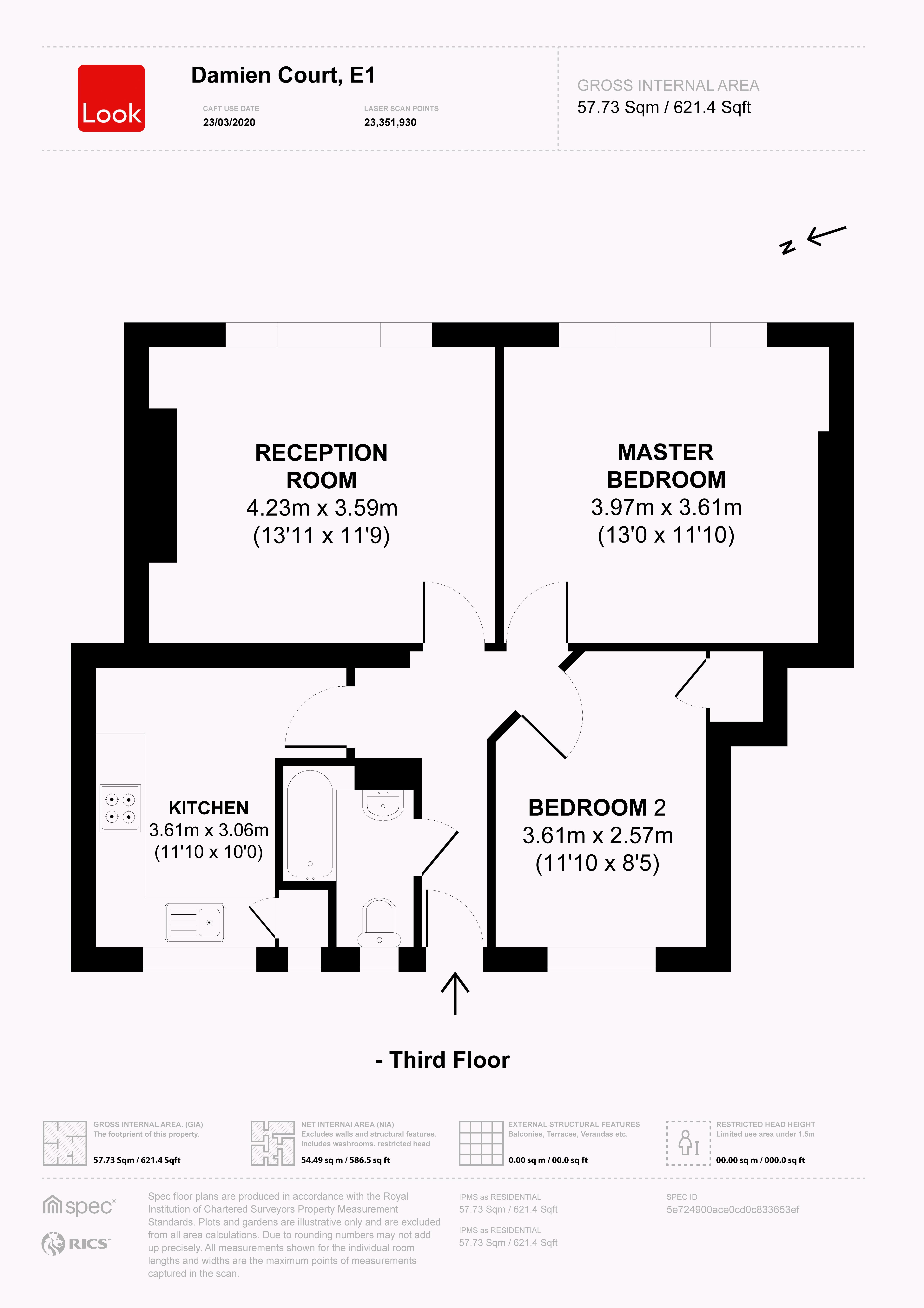 The 621 Square feet of accommodation, benefits from large windows, a generous sized reception room, two double bedrooms, a fitted and applianced kitchen and a white bathroom. The access to the front door is via the third-floor balcony at the rear of the building. There is an intercom, gas central heating and double glazing.
