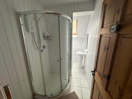 White suite comprising shower cubicle with Mira shower fitting. UPVC cladding. Pedestal wash hand basin. Velux window. Chrome towel radiator. Mira electric shower fitting with sliding screen door. Tiled floor.