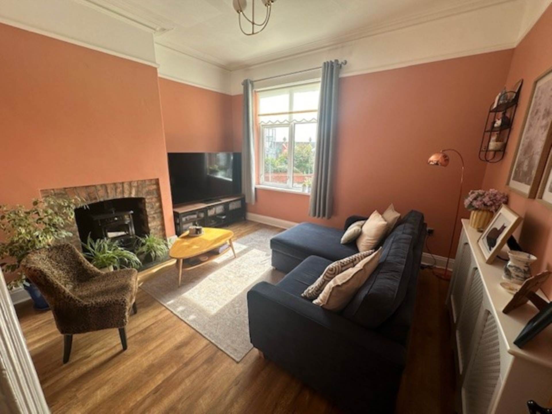 Laminate wood strip flooring. Cornice ceiling. Attractive brick built fireplace. (please note multi-fuel stove not inclusive).