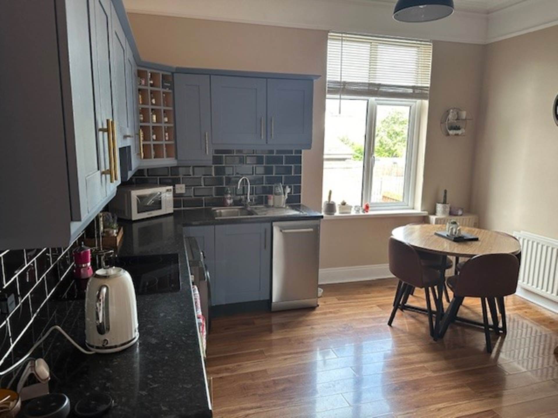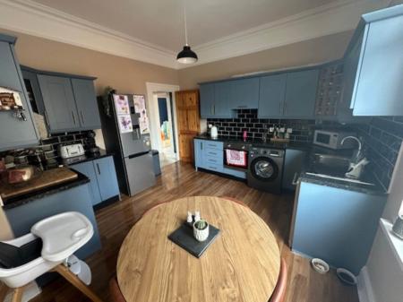 High and low level shaker style units. Single drainer stainless steel sink unit. Laminate work tops. Logik low level oven and matching ceramic hob unit. Laminate wood strip flooring. Cornice ceiling. Plumbed for automatic washing machine. Built in wine rack. Part tiled walls.
