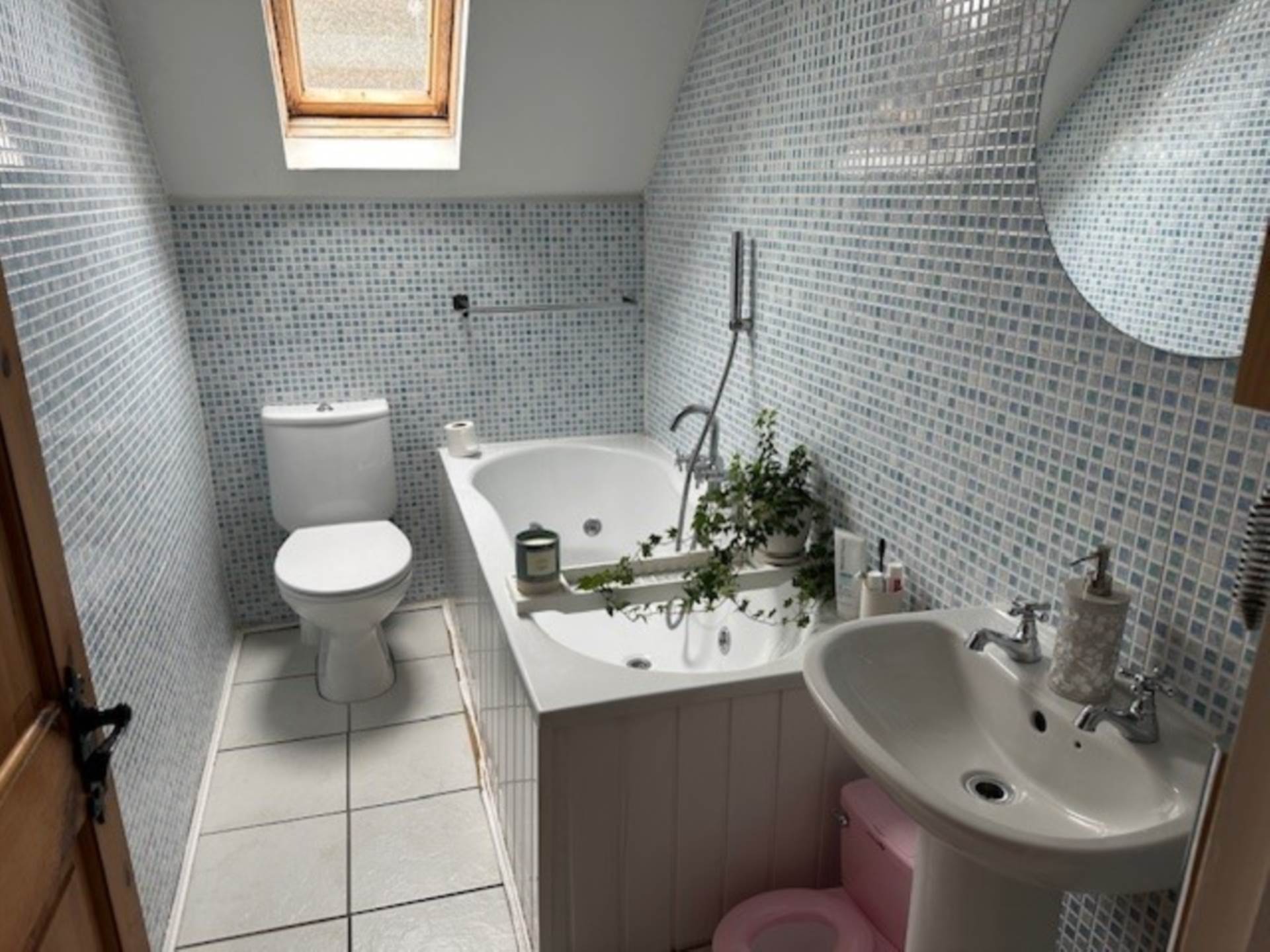 white suite comprising panelled whirlpool type bath. Pedestal wash hand basin. Low flush WC. Chrome towel radiator. Velux window.Tiled floor. Tiled walls.