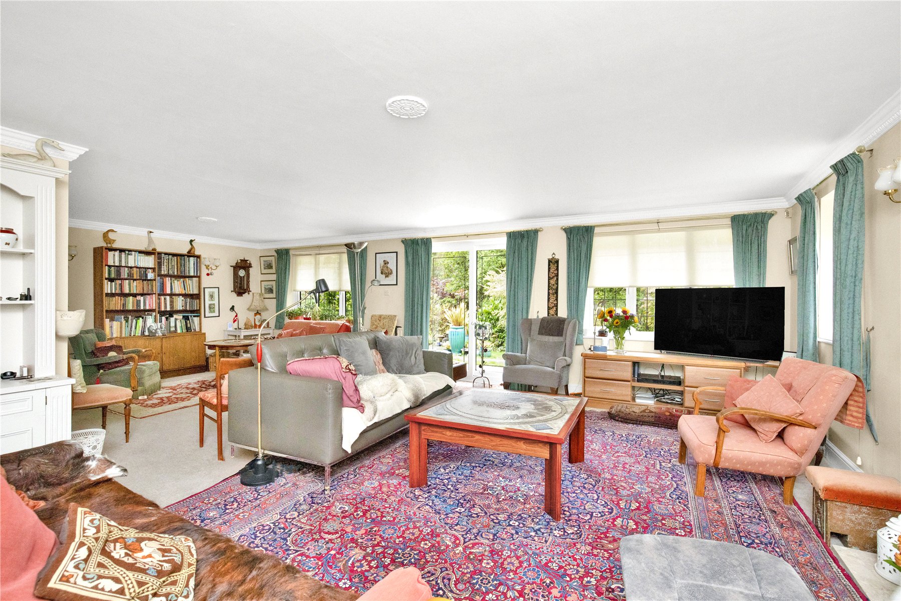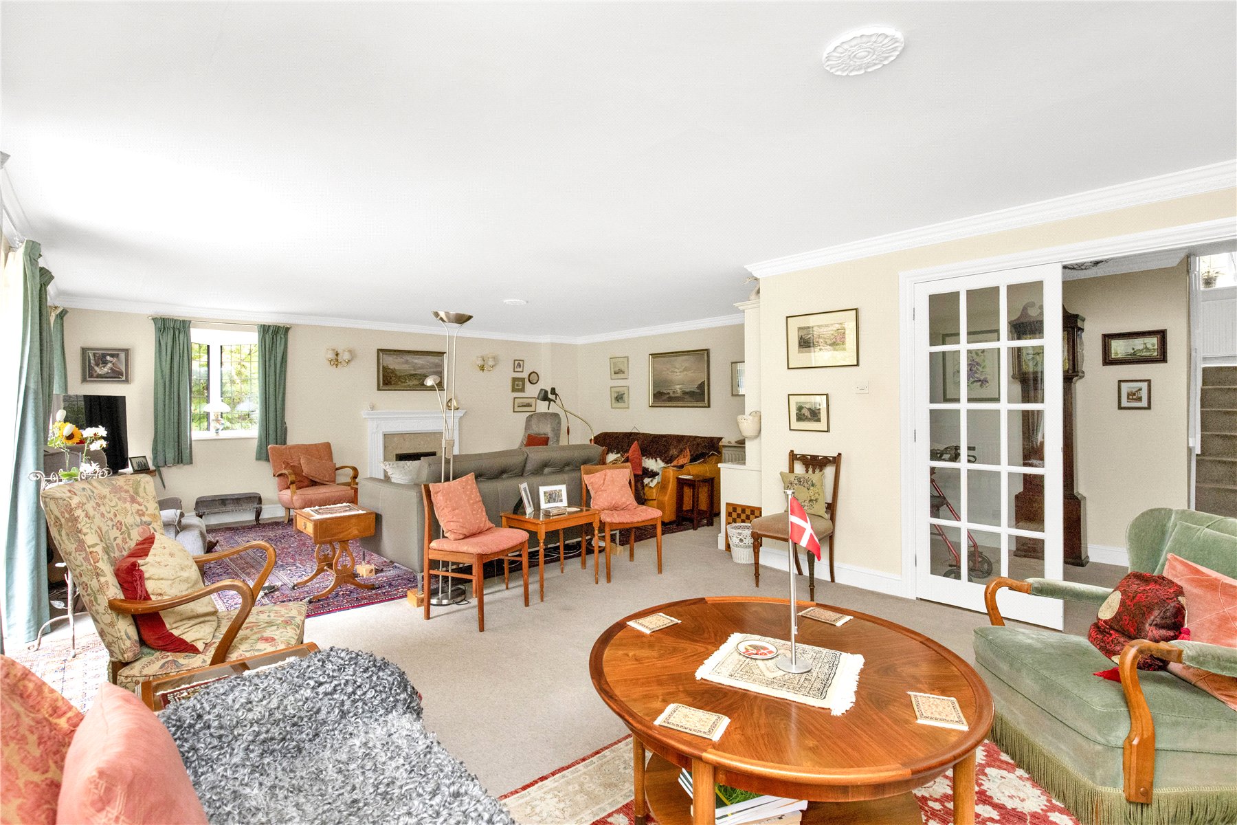 Continuing with the reception space there is a large L-shaped sitting room, some 27'3 wide with both windows and patio doors overlooking the rear garden and a central fireplace with gas fireplace providing a central focal point.