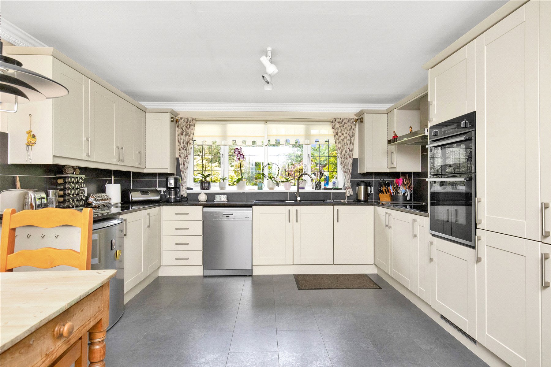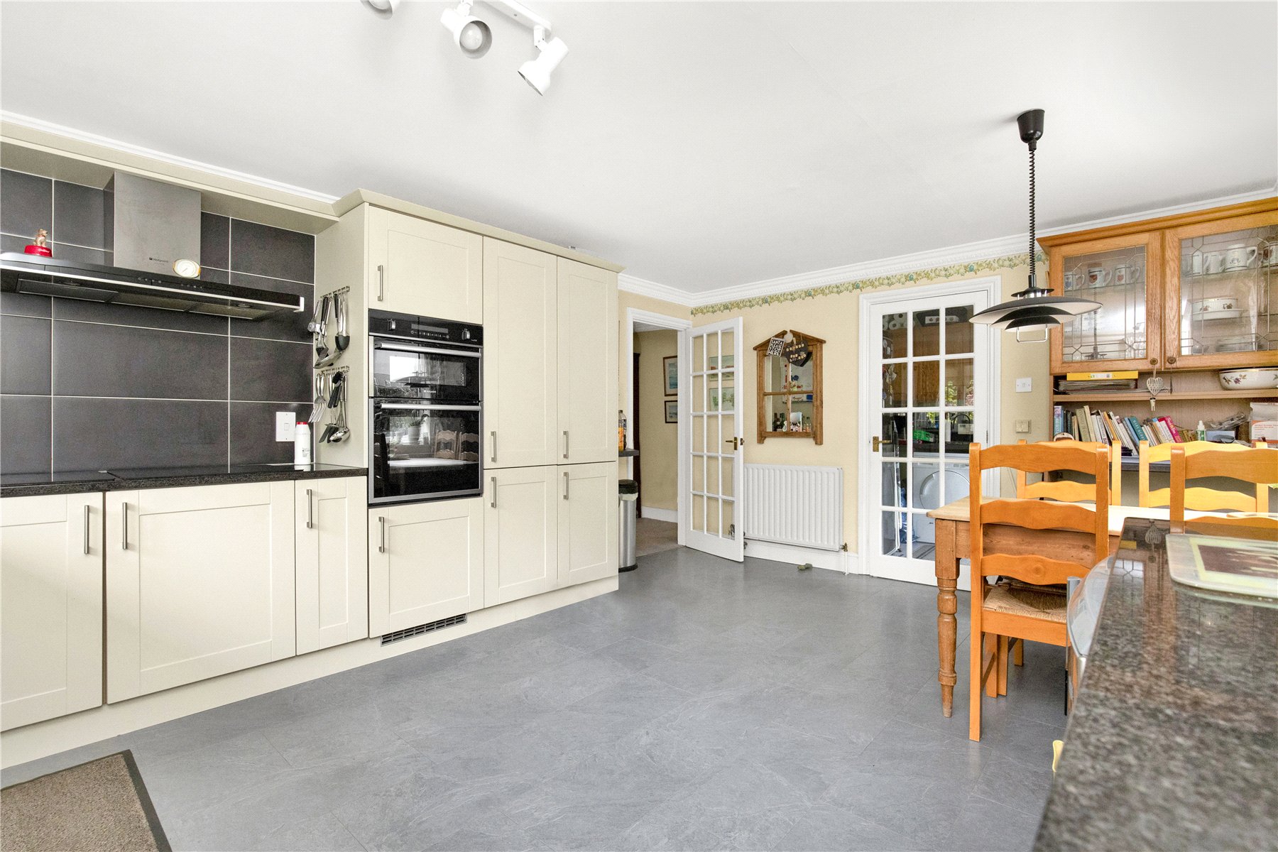 Double aspect kitchen with space for a breakfast table as well as access into a utility room with side access to the garden. The kitchen is fitted with an extensive range of drawer and cupboard storage plus integrated double oven, 2 electric hob ring and 4 ring induction hob with space for a dishwasher and fridge.