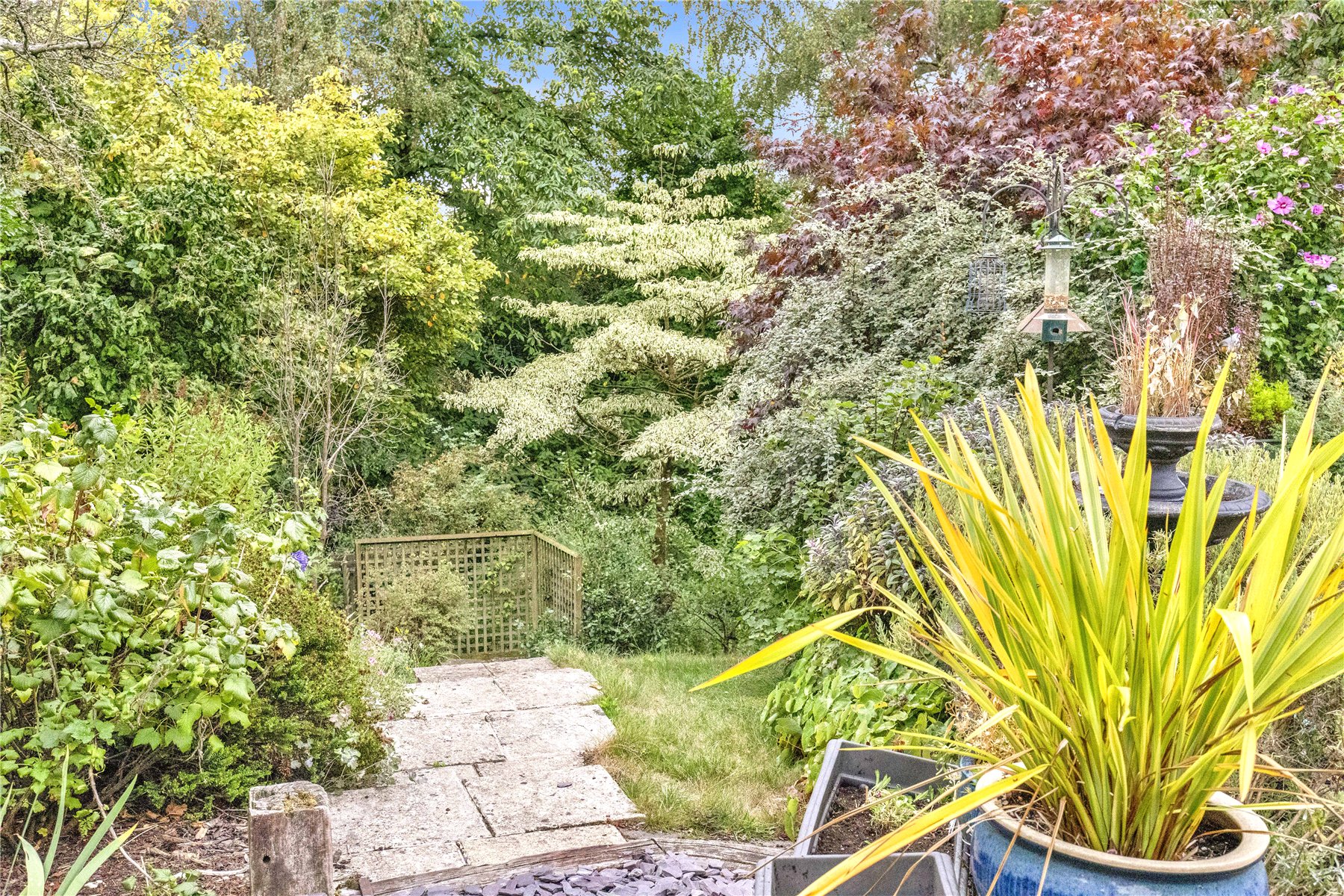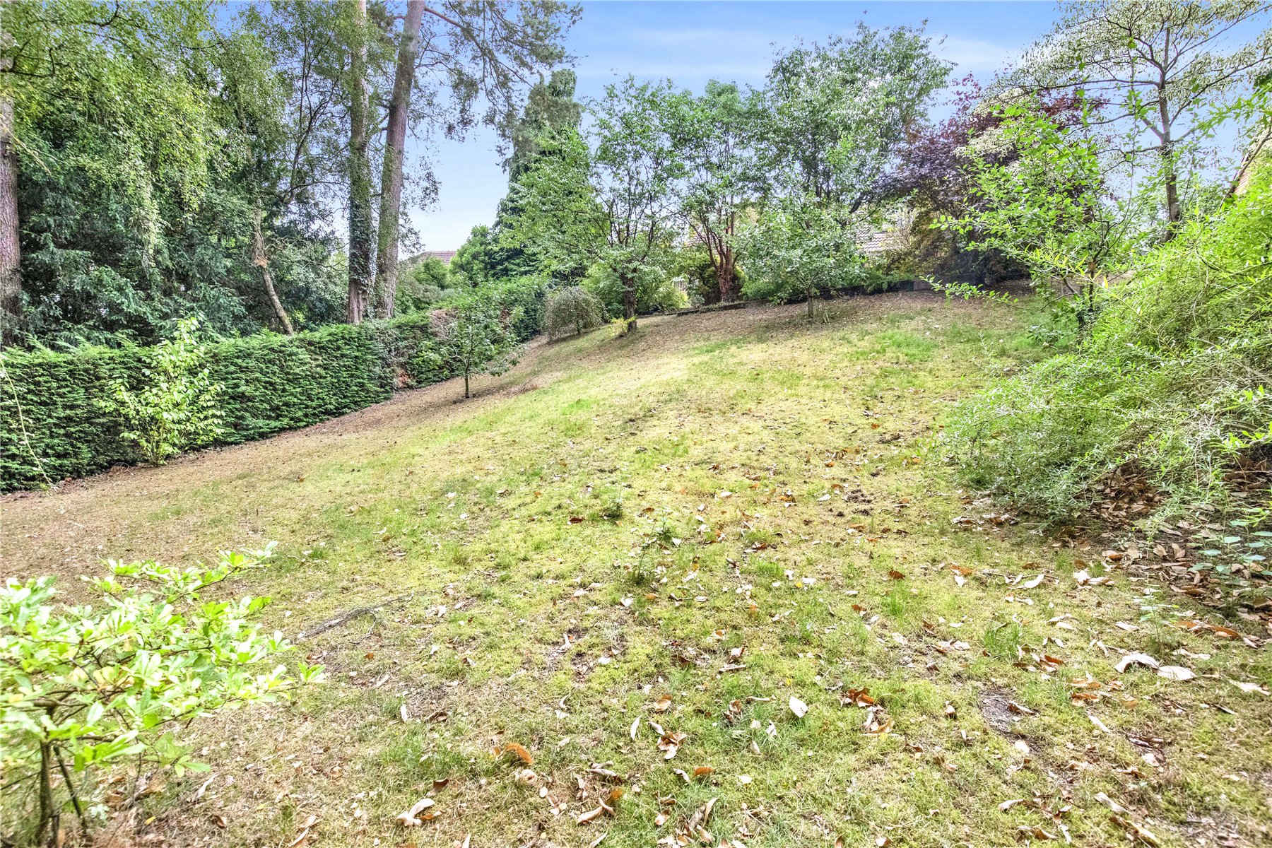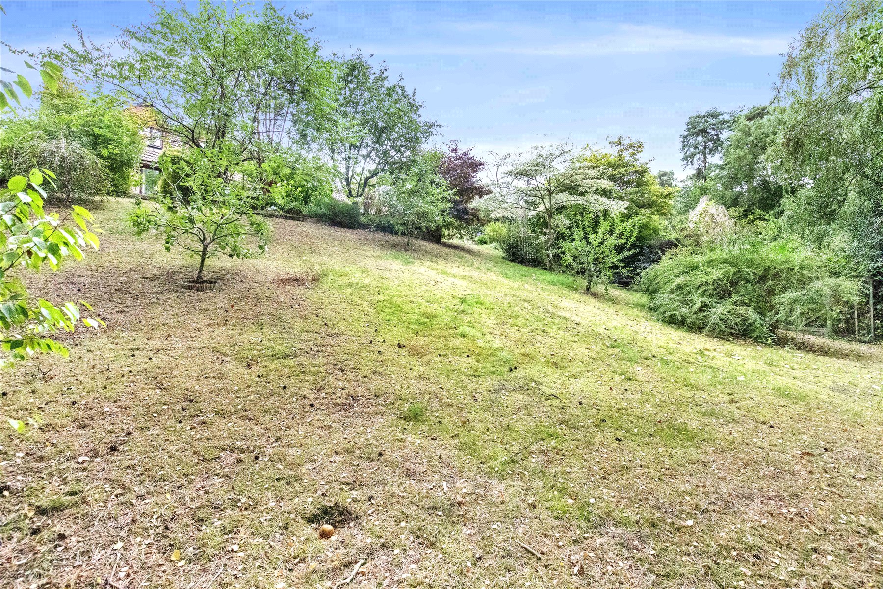 Adjacent to the rear of the house and extending around the side of the kitchen is a paved patio providing an ideal entertaining space, with a tucked away garden shed providing useful storage. Extending away from the patio is a lawn flanked by mature well stocked flower beds with a further larger lawn beyond sloping down to the bottom of the plot interspersed with mature trees and shrubs including apple trees, acers, camelias, and roses. At the bottom of the lawn is are a couple of fruit cages and access into private light woodland.