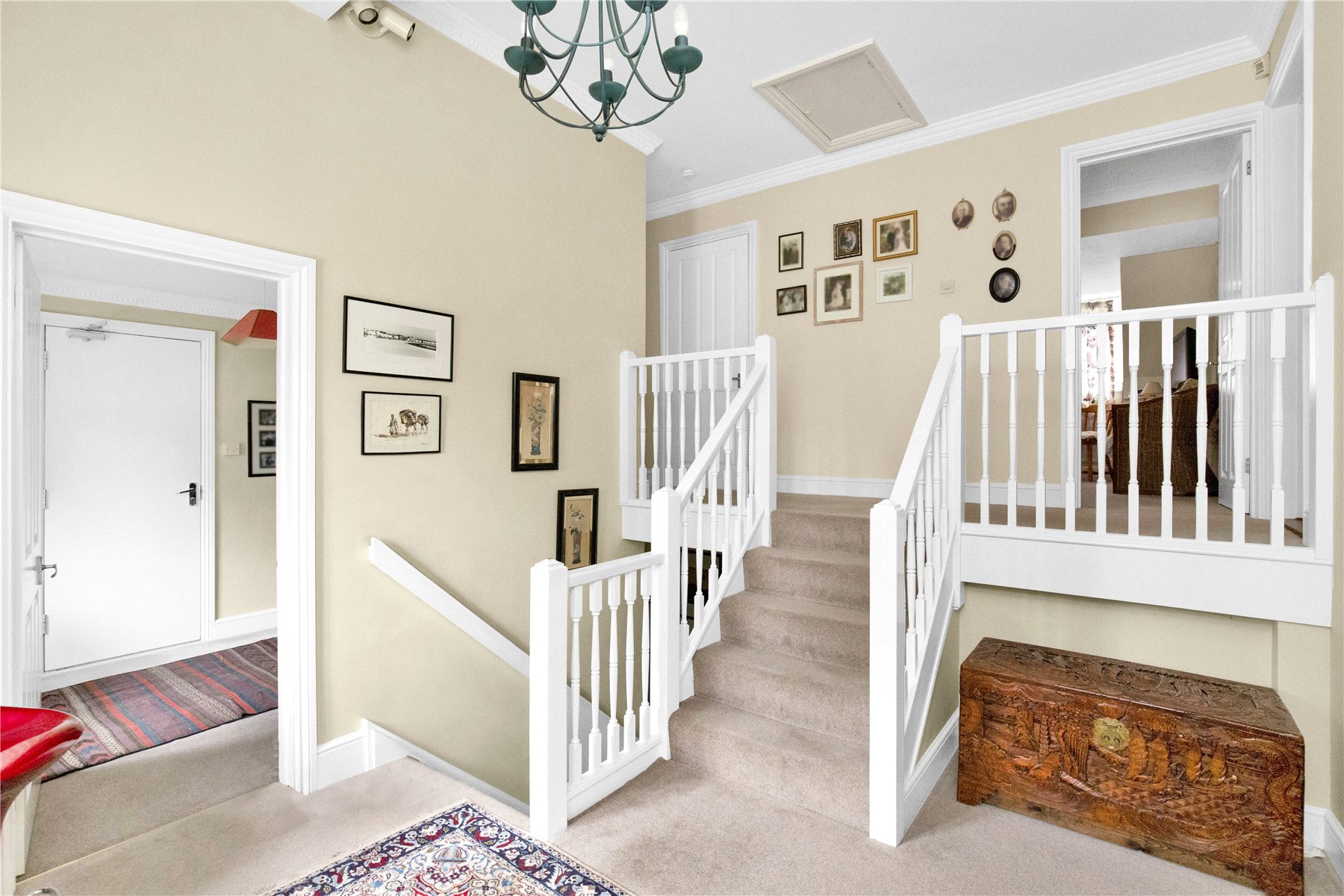 From the hall are a half set of stairs down to further reception rooms and another half set of stairs up to the bedroom accommodation.