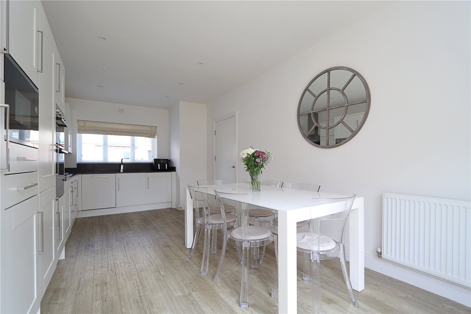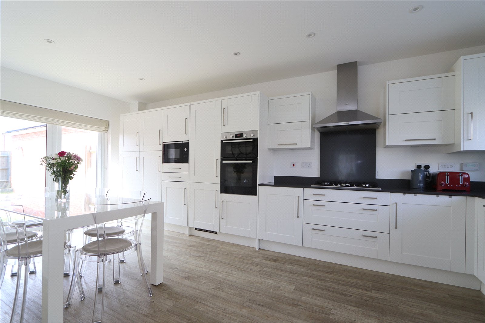 The property is comprised over three well-proportioned floors and includes: an entrance hallway with large guest cloakroom, bay fronted office, spacious dual aspect living room and a stunning, 20ft kitchen/diner complete with granite splash backs and work surfaces, Built-in Bosch appliances include a dishwasher, a washing machine, a fridge and a freezer. There is also a double electric oven and a five ring gas hob with extractor canopy over. Additional fixtures were added to include an in-built microwave, separate freezer and cupboards. The breakfast area has French doors to the rear garden.