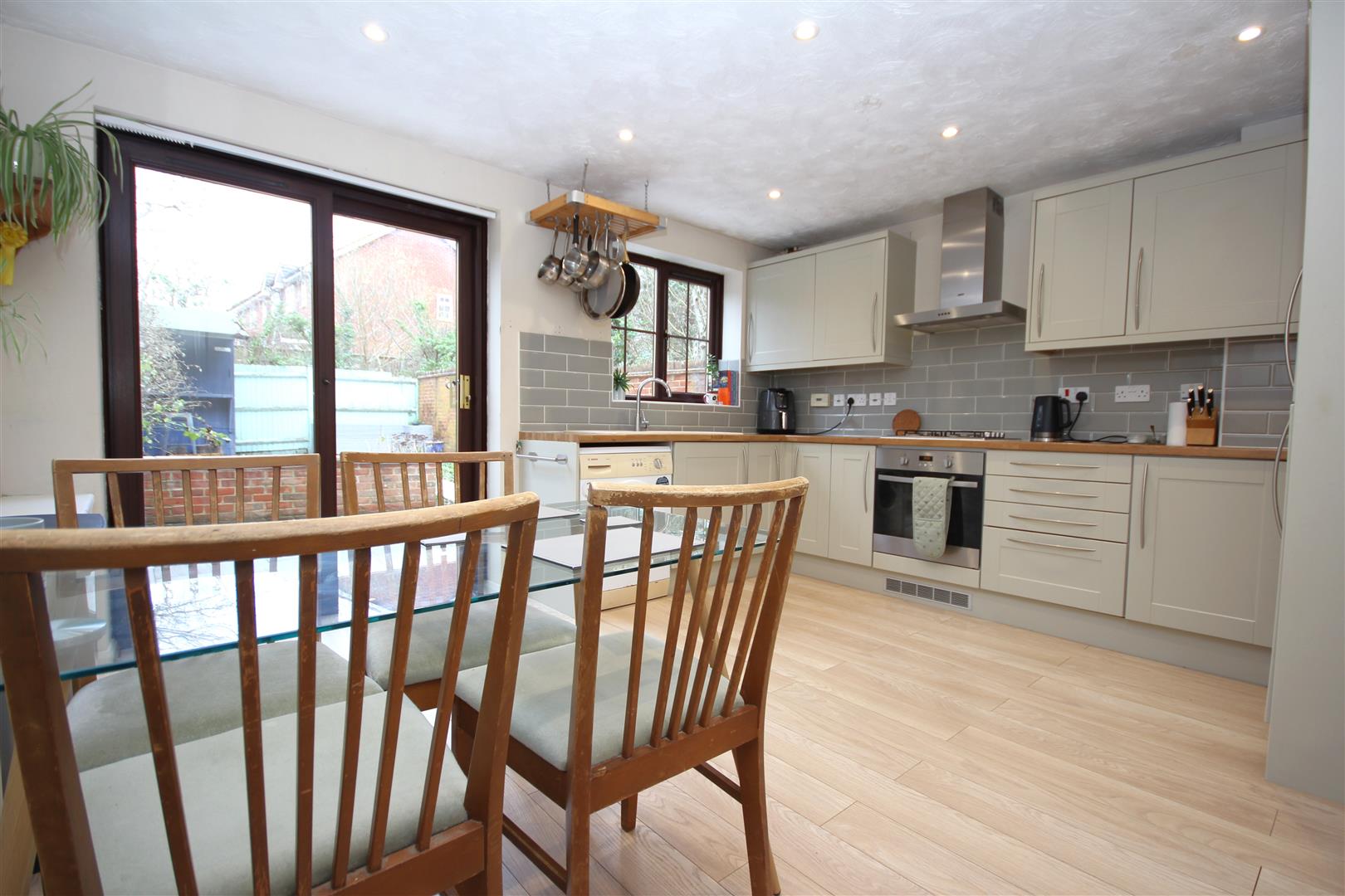 Modern kitchen/dining room enjoying attractive cabinets, wood effect worktops, understairs storage cupboard & patio doors opening out to the rear garden