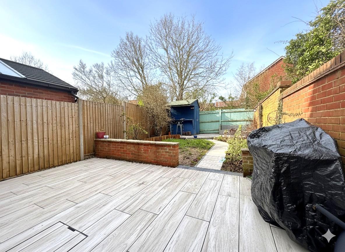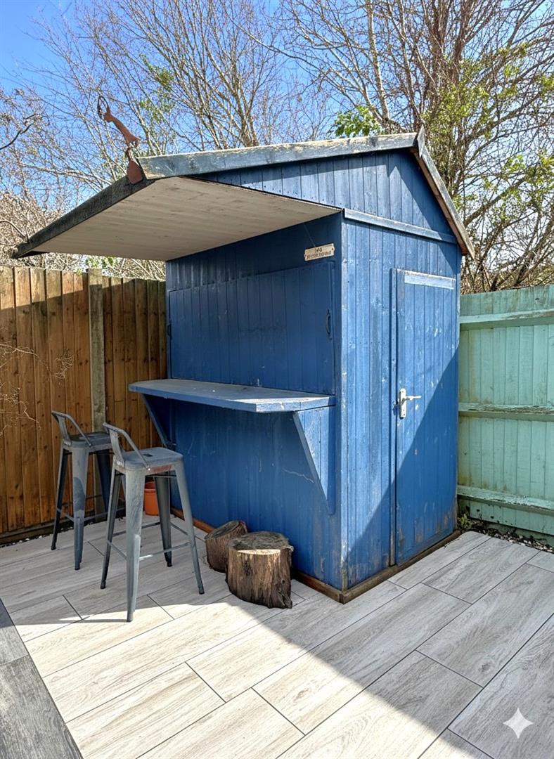 Landscaped rear garden enjoying porcelain tiled patio areas, area laid to lawn with display shrubbery, feature tikki bar to remain & side access