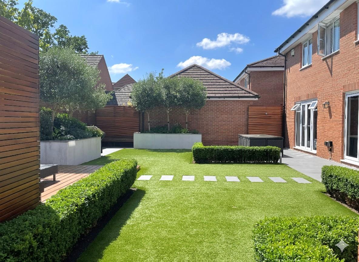 Beautifully landscaped garden enjoying extensive paved patio, decked seating area with lighting, large area of artificial lawn with box hedging and raised flower beds with established olive trees