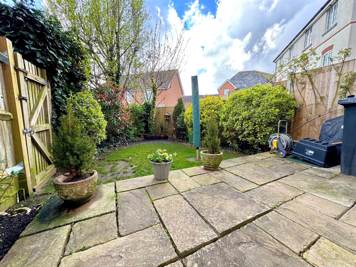 Landscaped garden with paved patio, area laid to lawn with mature shrubbery & side access