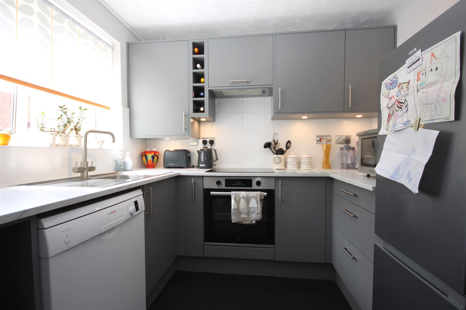 Modern re-fitted kitchen enjoying attractive marble effect worktops, integrated oven and hob with space for additional appliances