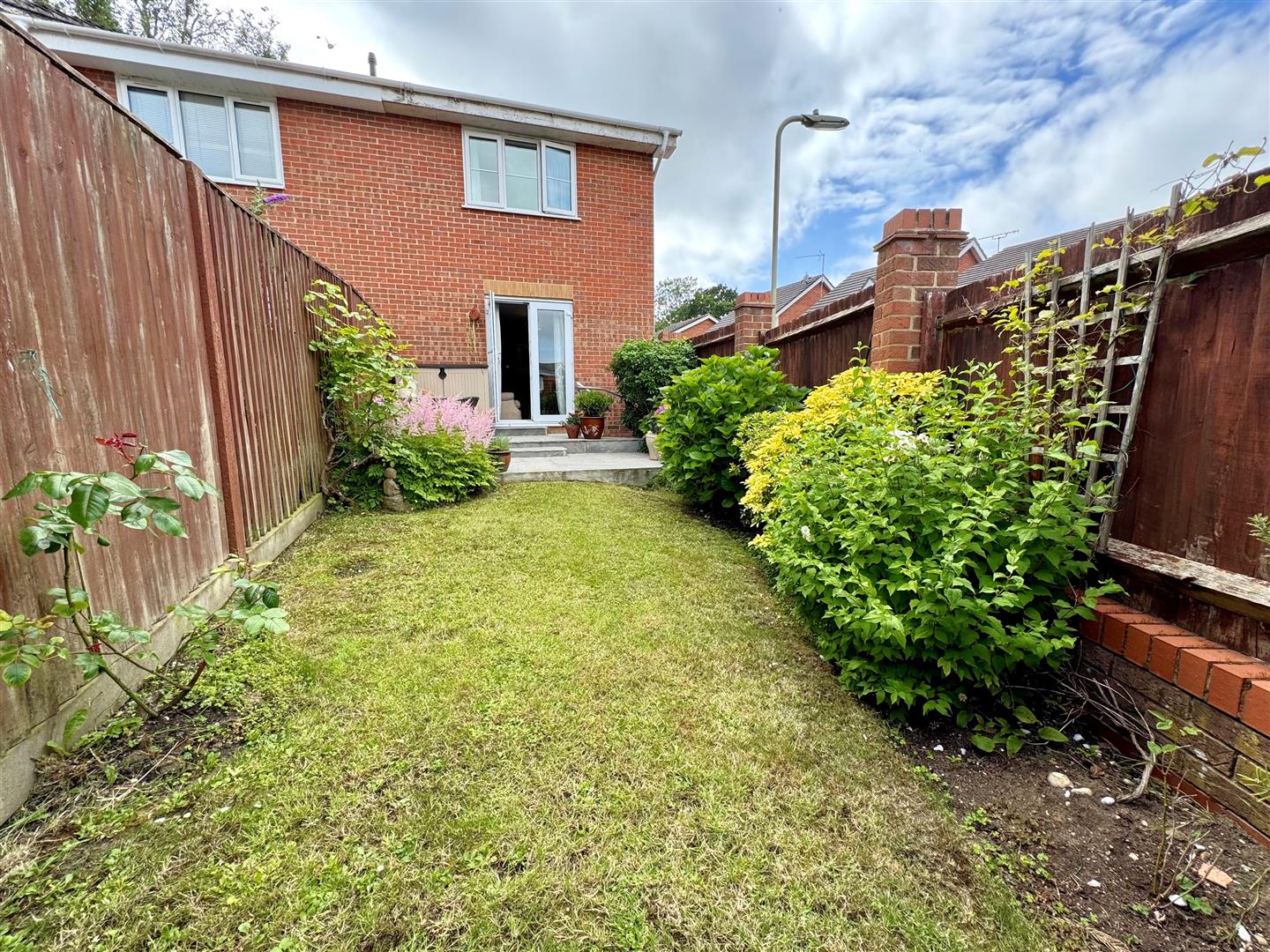 Rear landscaped garden laid to paved patio with lawn area and display flower/shrubbery