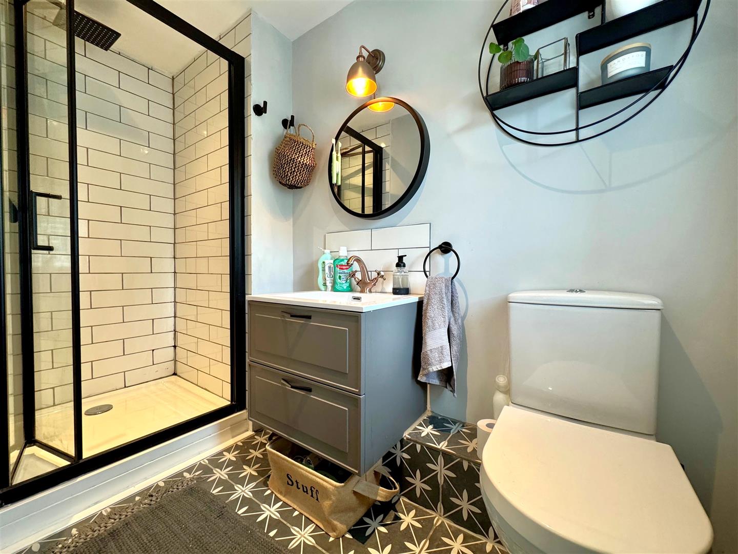 Modern en-suite shower room comprising three piece white suite, attractive wall tiling & mosaic style flooring