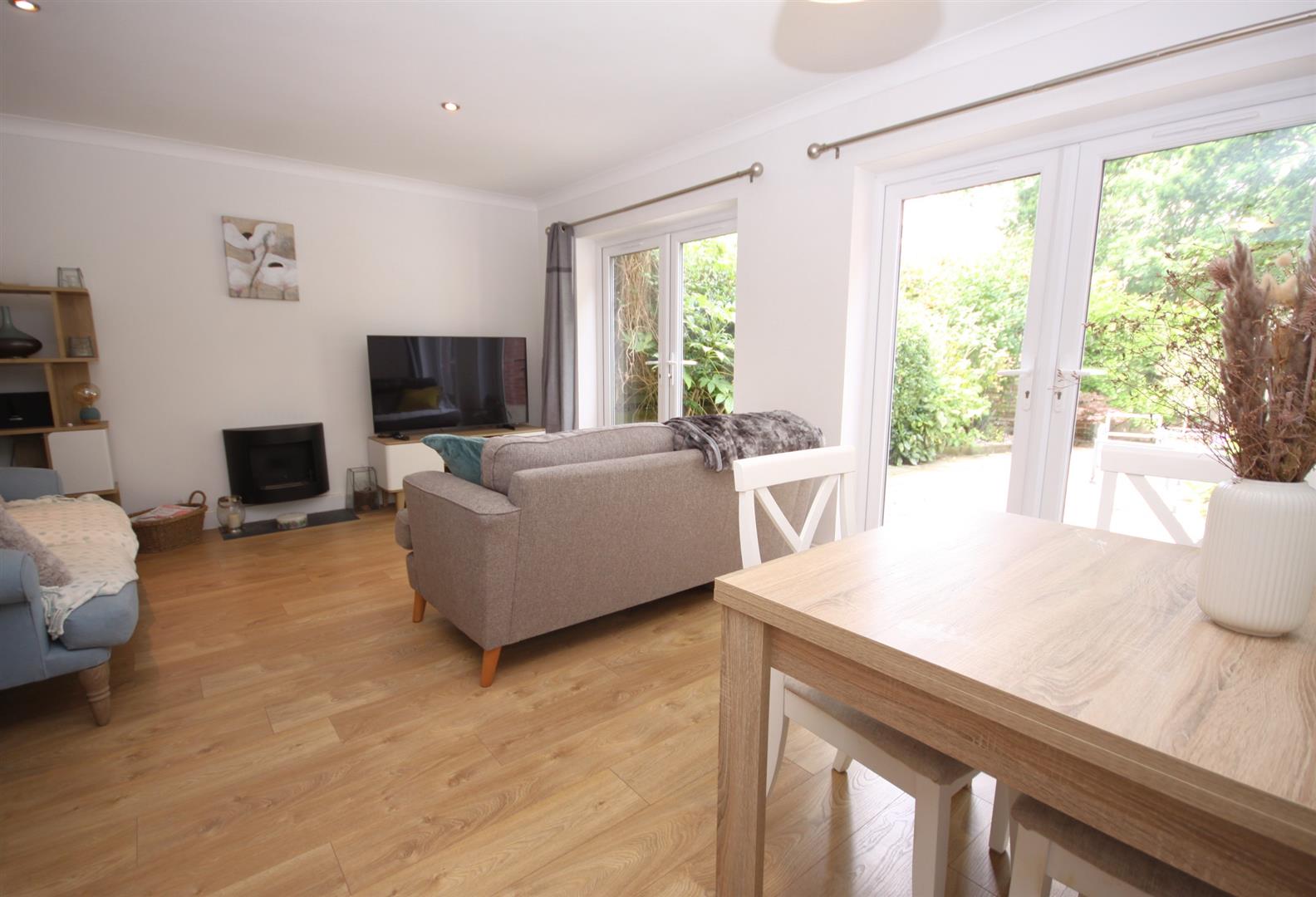 L shaped lounge/dining room with centrepiece contemporary fireplace & twin double doors opening out into the rear garden