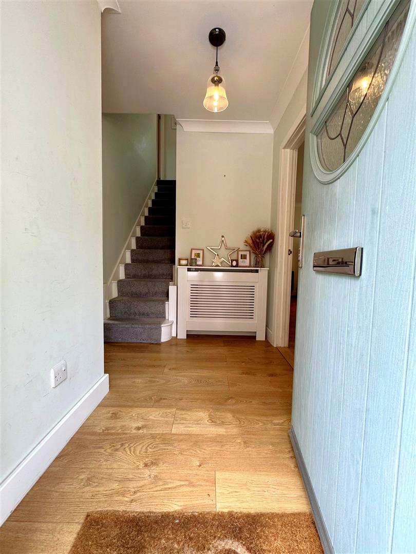 Welcoming entrance hall enjoying attractive wood effect laminate flooring flowing into the lounge/dining room & downstairs cloakroom
