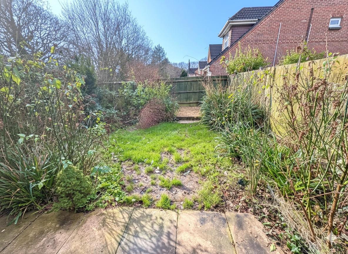 Enclosed landscaped rear garden laid to lawn, paved patio, shingled area with display shrubbery/flower beds