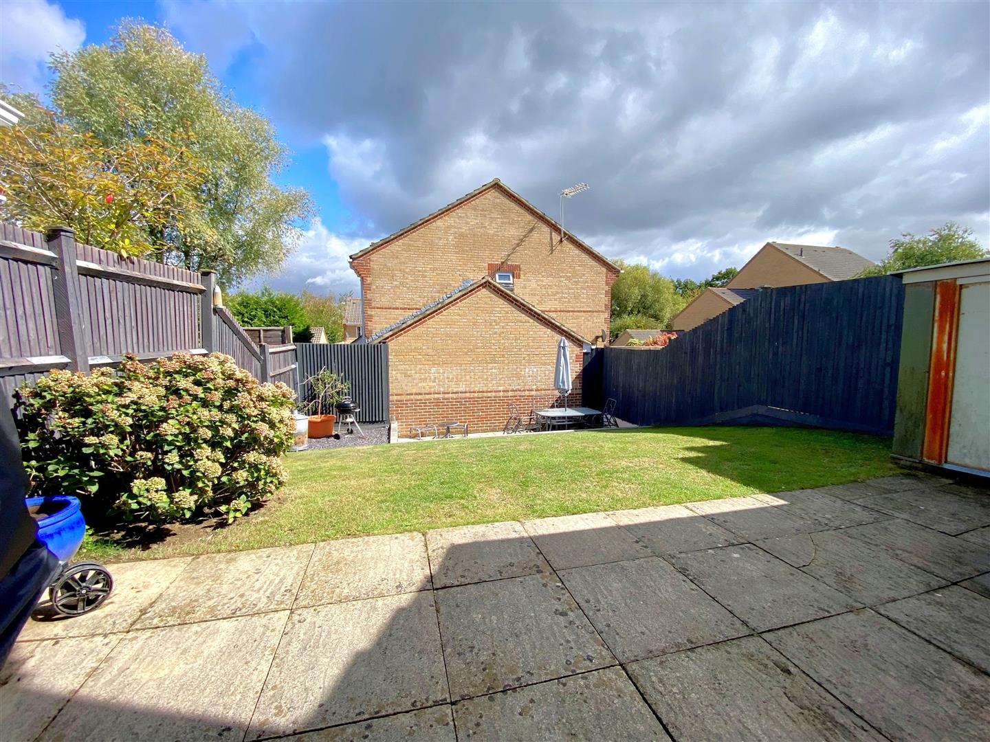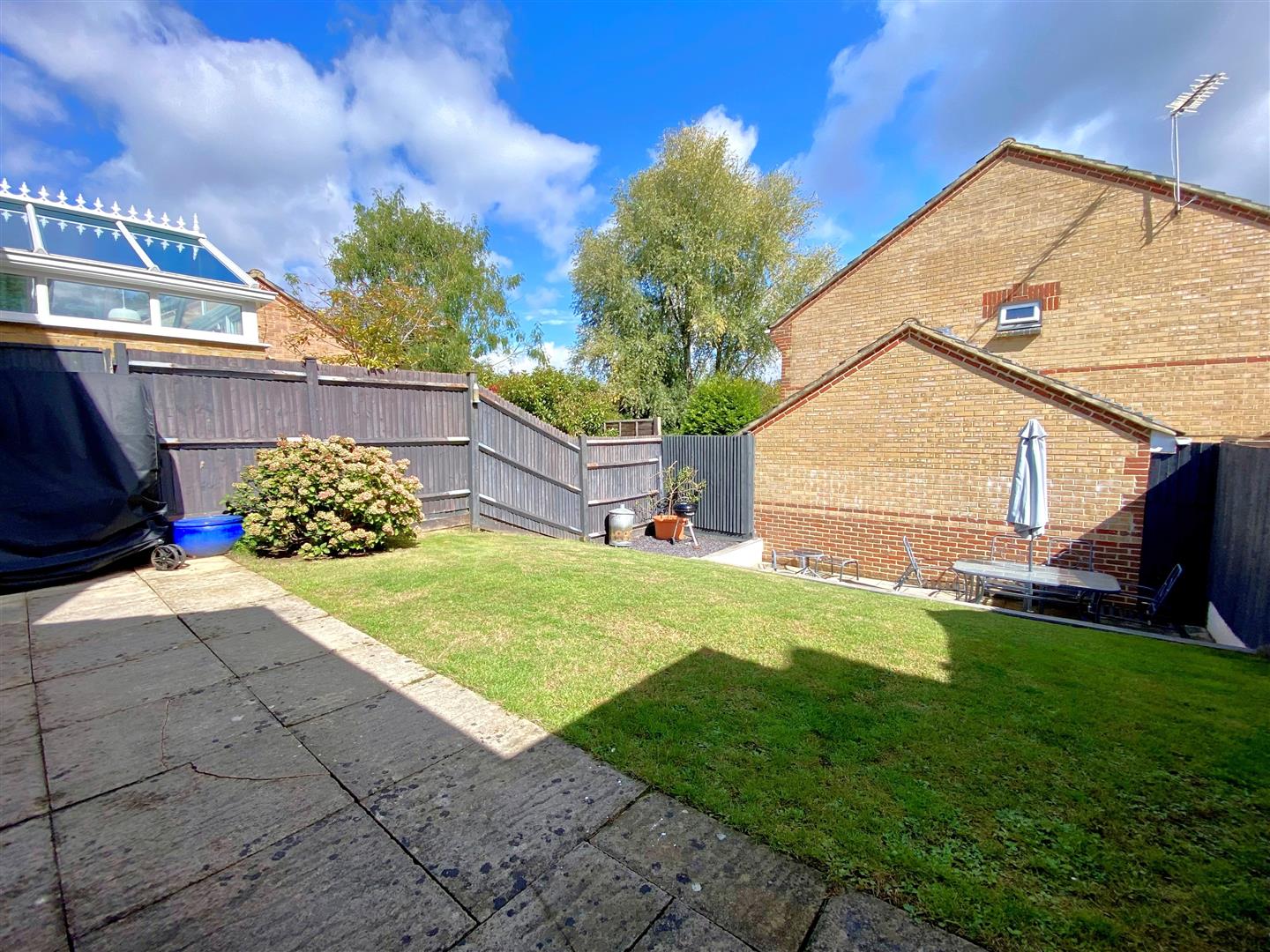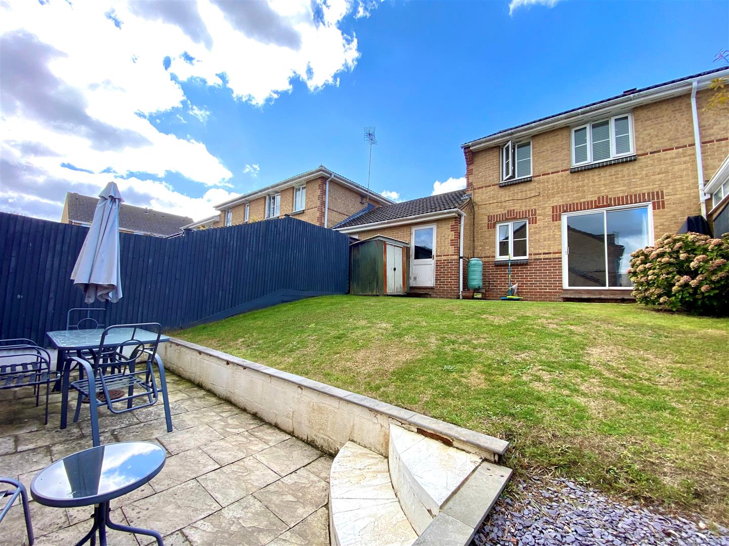 Landscaped rear garden majority laid to lawn, two paved patio areas & display flower/shrubbery