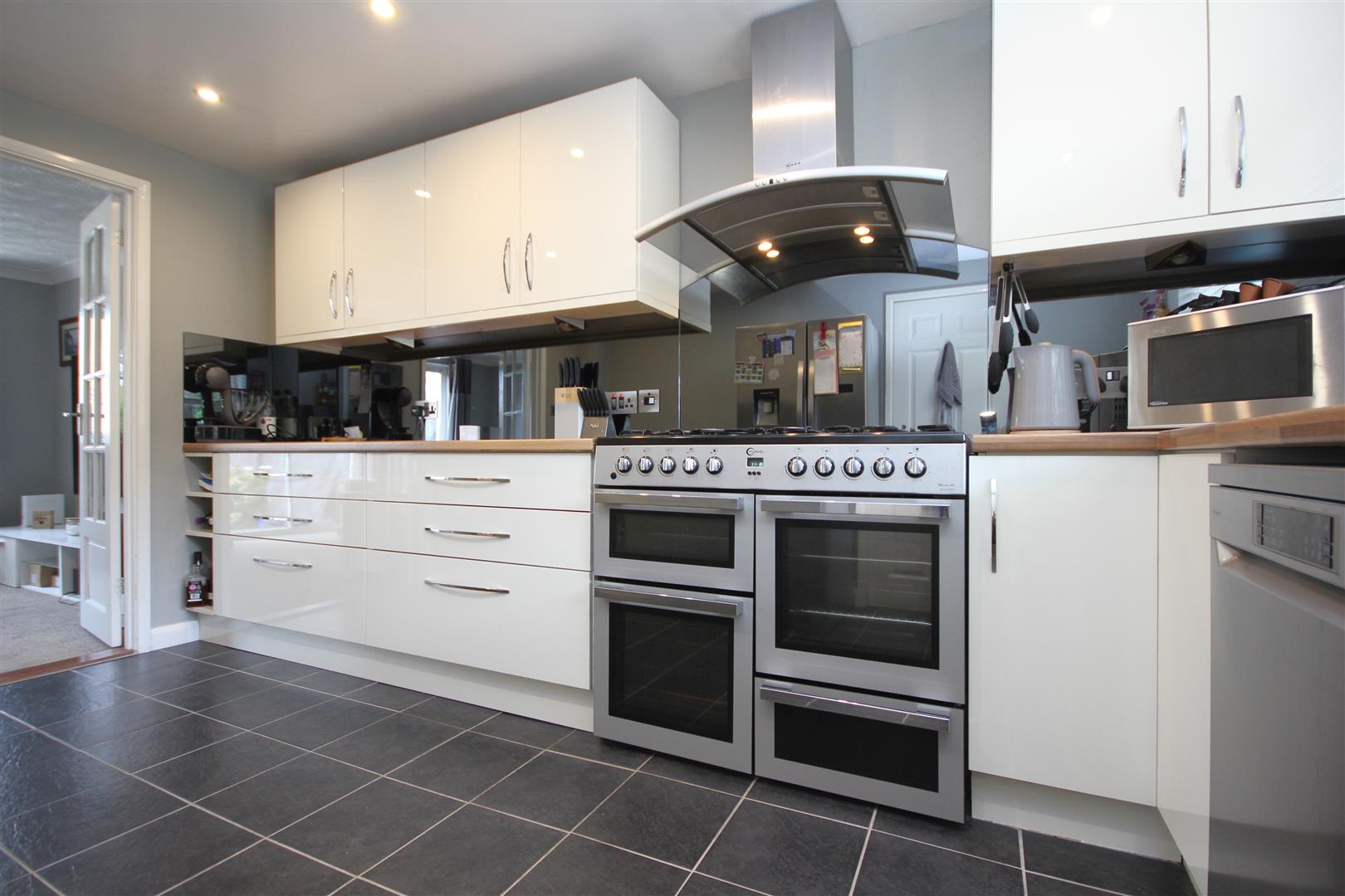 Modern kitchen/dining room with space for appliances & double doors into the lounge