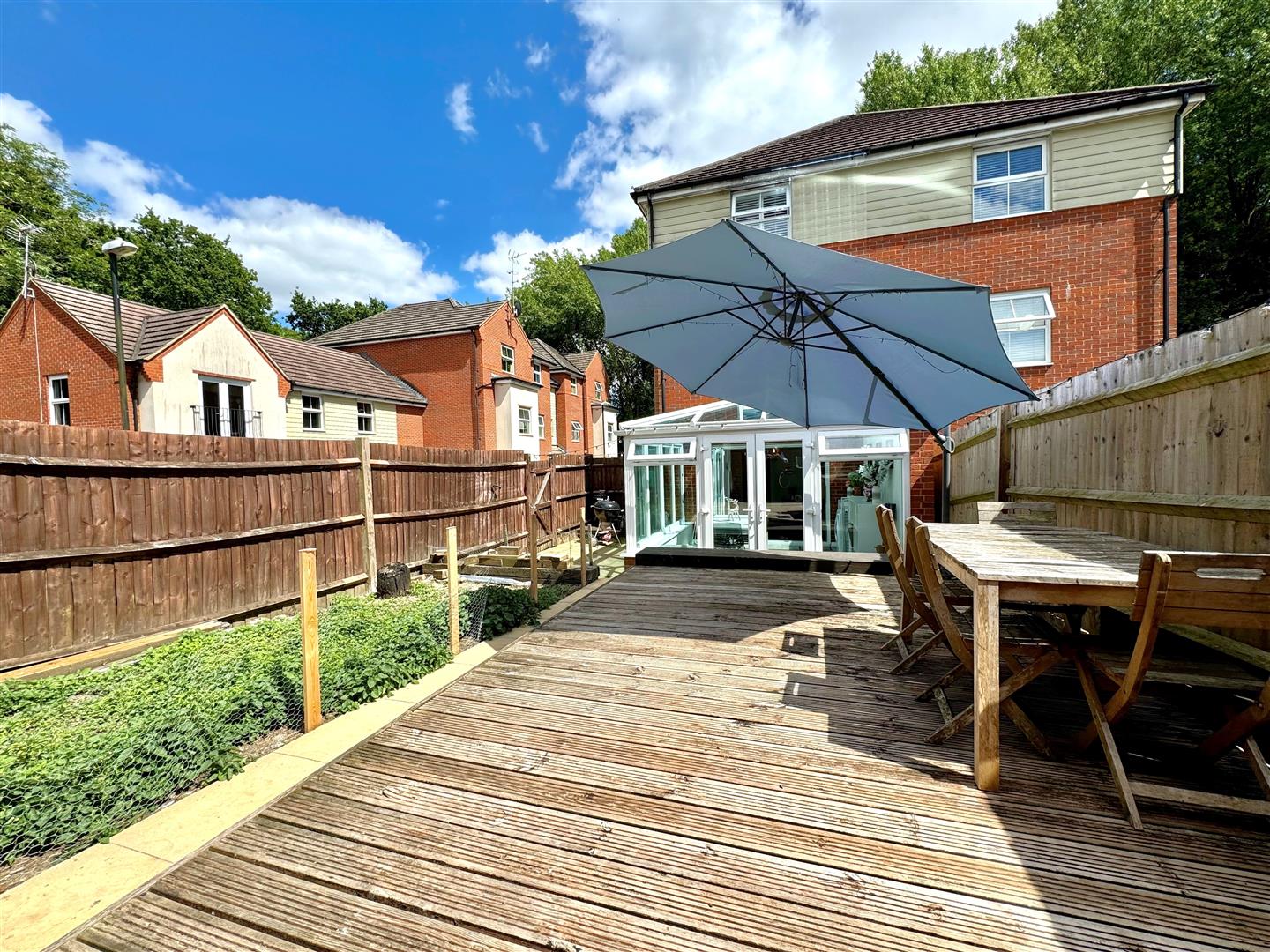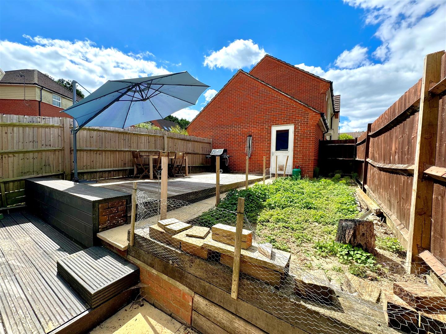 Rear enclosed landscaped garden laid to decked sun terrace, paved patio & side access